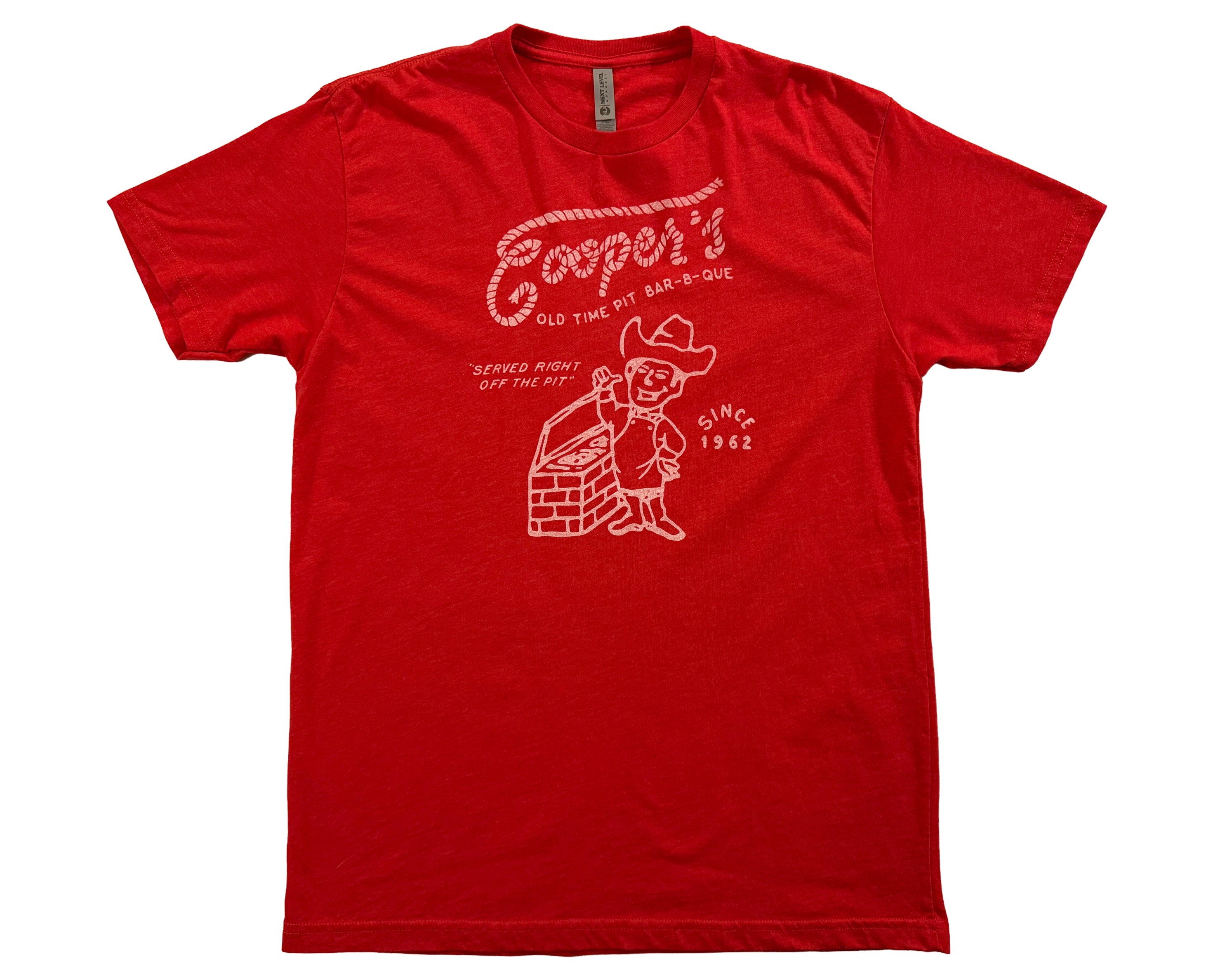 Printed for Cooper’s Old Time Pit Bar-B-Que, this t-shirt references a long-standing Texas barbecue institution founded in 1962. Cooper’s is best known for its direct-heat mesquite pits and its straightforward approach to barbecue, with meats cooked over open fire and sauce served on the side rather than brushed on. The graphic includes the original “served right off the pit” line alongside a simple illustrated pitman, reflecting the no-frills branding the restaurant has used for decades. Produced on a red Next Level Apparel blank in a cotton-poly blend, the shirt has a soft, worn-in feel with a clean, legible print.