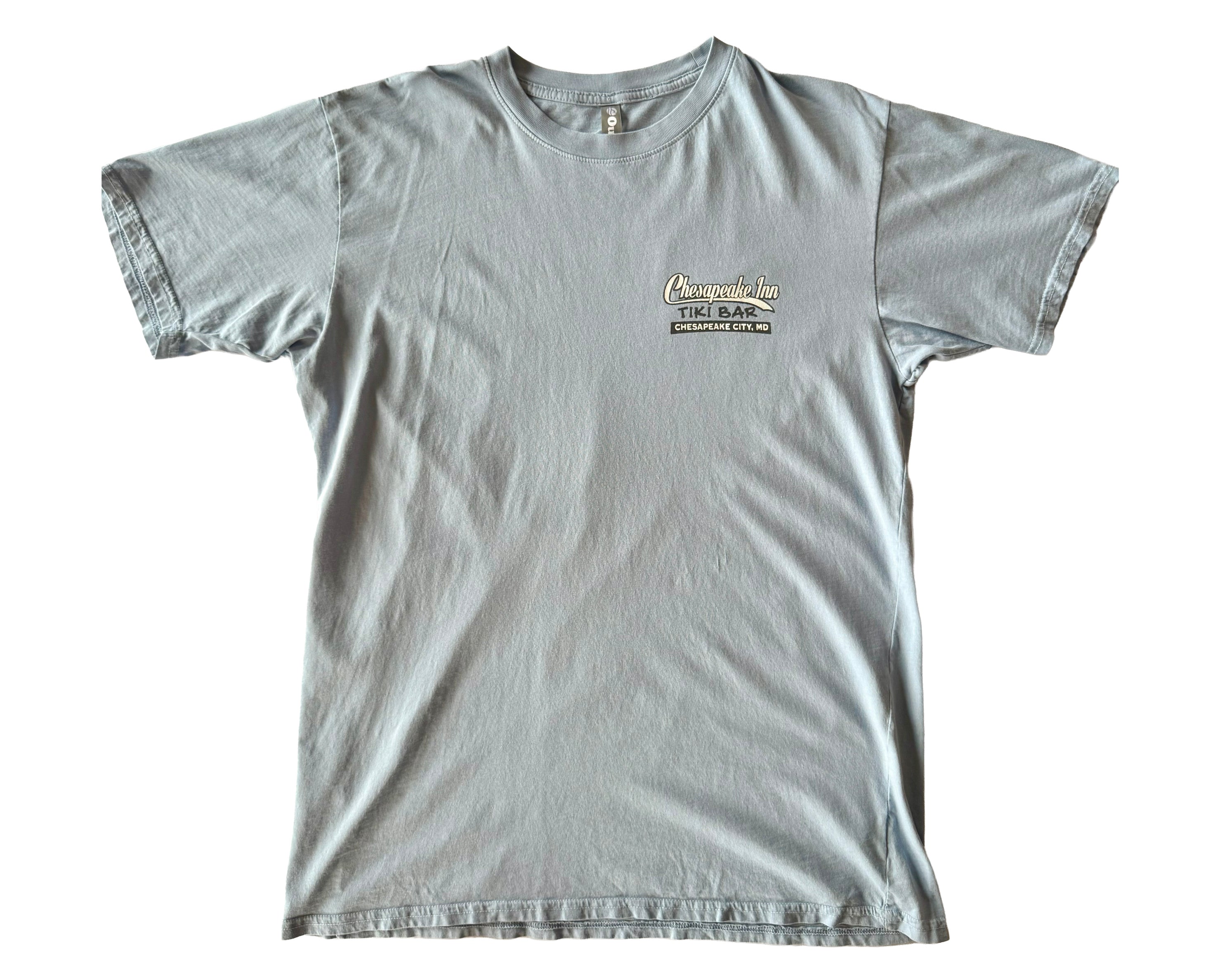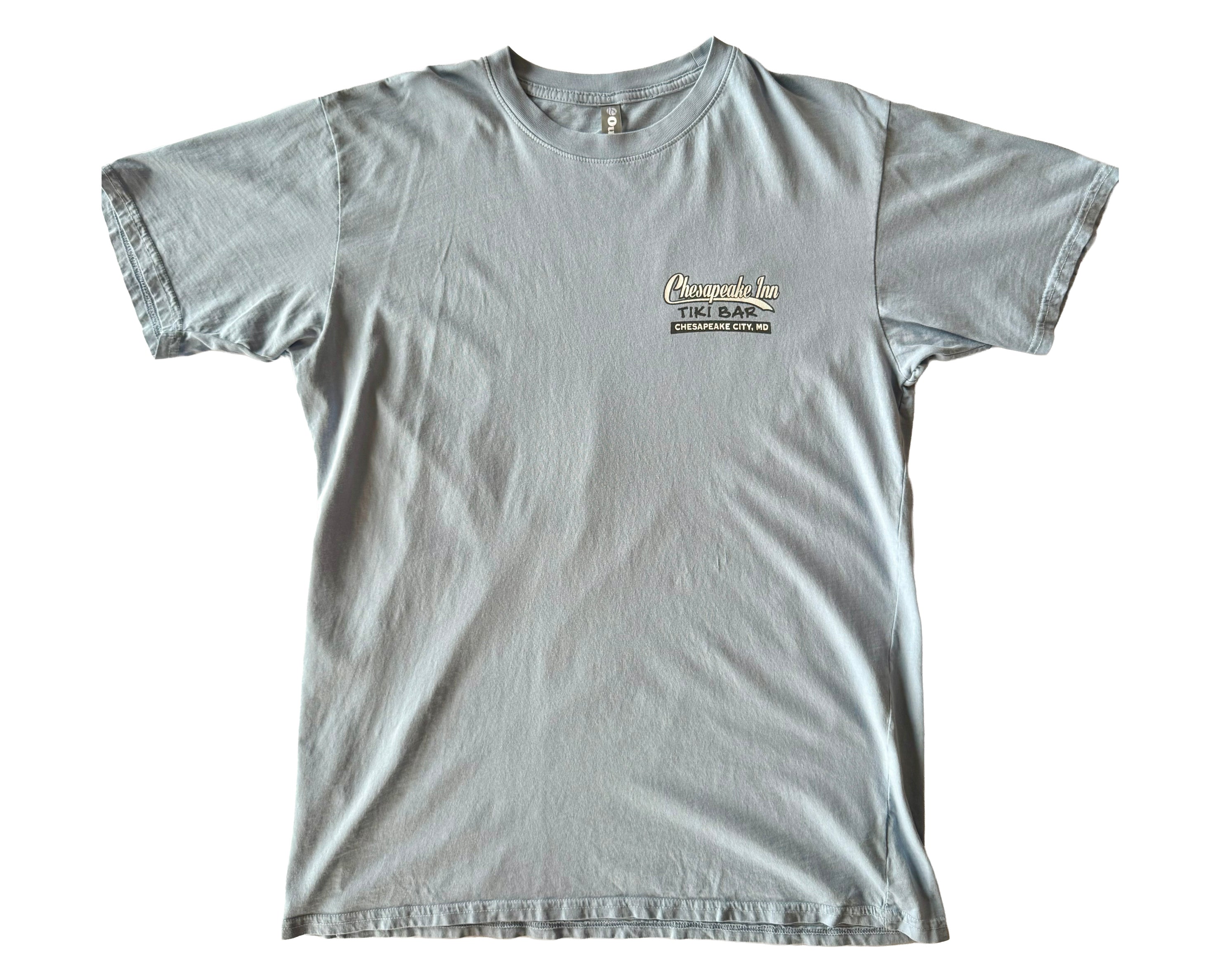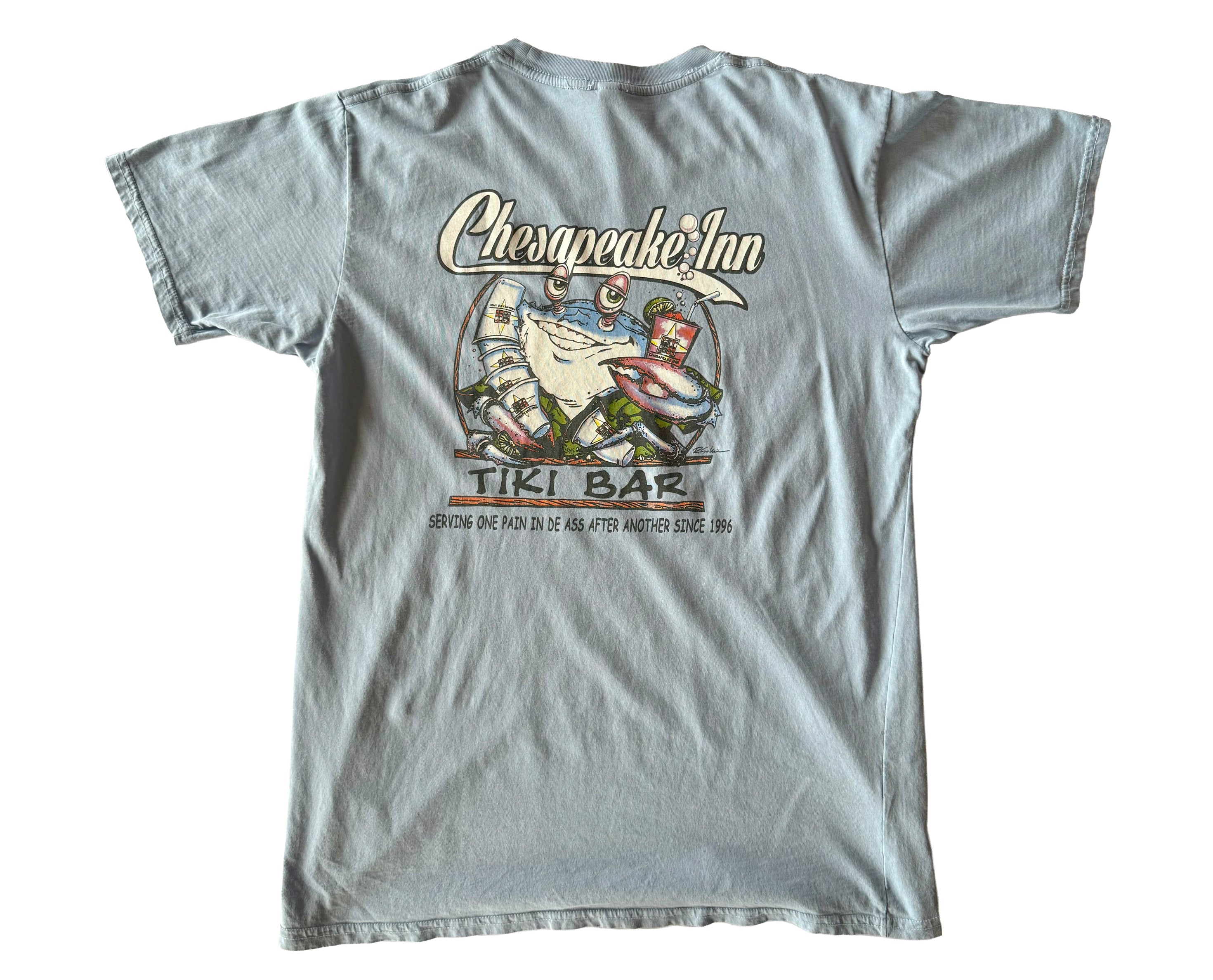 This Chesapeake Inn Tiki Bar t-shirt captures the coastal party spirit of Chesapeake City, Maryland. Featuring a bold crab illustration holding drinks, the back print reads “Serving one pain in de ass after another since 1996,” adding a cheeky twist that nods to the bar’s legendary reputation. The front chest design keeps it simple with a small “Chesapeake Inn Tiki Bar” logo and location detail. Made from 100% cotton by Ouray, the tee has a soft, lived-in feel with a classic fit that makes it ideal for casual wear. Originally sold at the popular waterfront bar, this shirt brings a slice of tiki culture and East Coast charm to your wardrobe. A perfect piece for anyone who loves vintage bar tees, coastal nostalgia, or simply a standout graphic with personality.