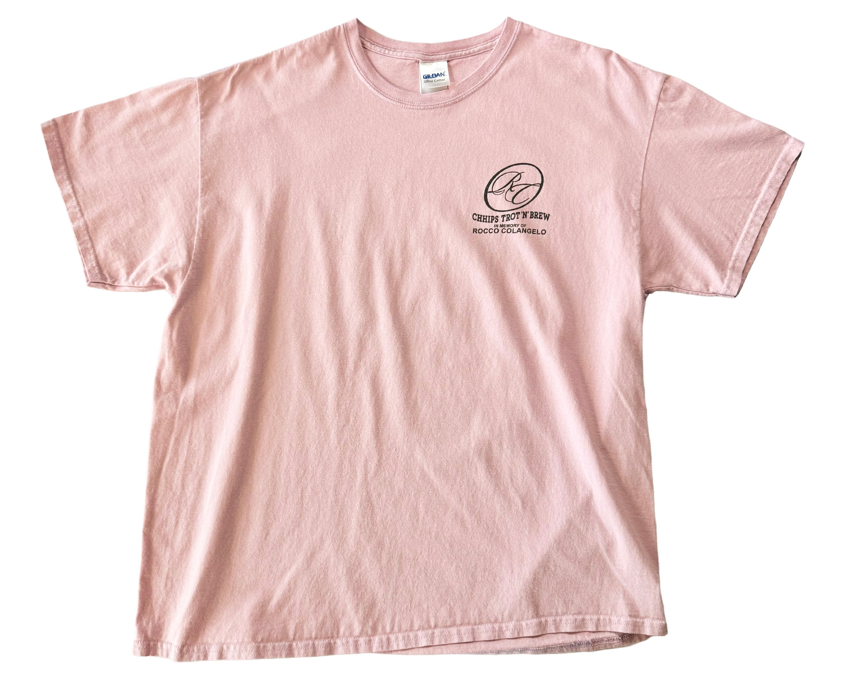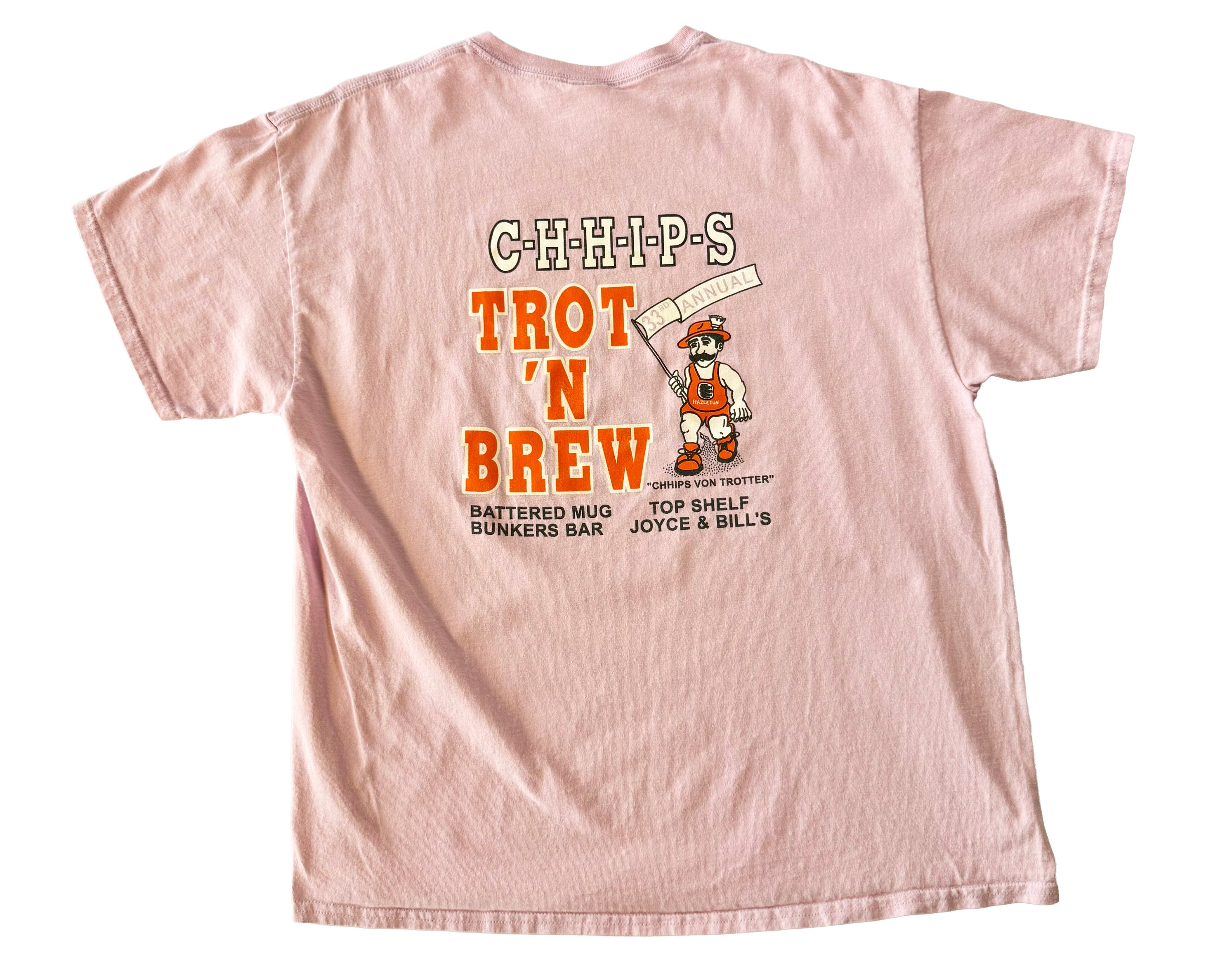This Chhips Trot ’N Brew T-shirt captures the spirit of a beloved community tradition. Featuring bold back graphics with “33rd Annual Trot ’N Brew,” it highlights sponsors like Battered Mug, Bunkers Bar, Top Shelf, and Joyce & Bill’s, alongside the event mascot “Chhips Von Trotter.” The front chest print adds a personal touch with the name Rocco Colangelo, giving the shirt real local flair. Printed on a soft pink Gildan Ultra Cotton tee, it’s both comfortable and full of character. A true piece of grassroots Americana that celebrates small-town events where sport, fun, and beer come together.