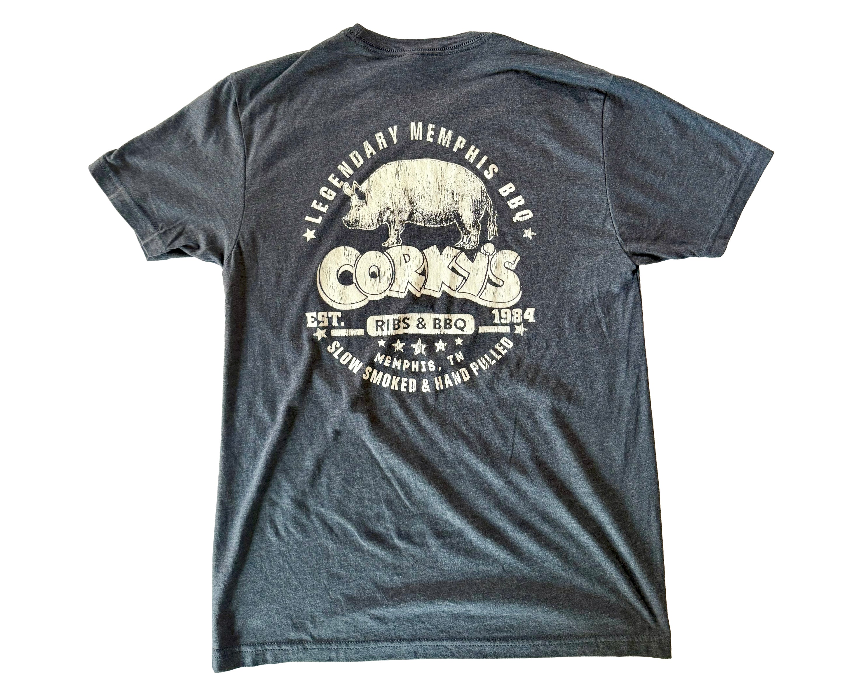 This vintage-style Corky’s Ribs & BBQ T-shirt celebrates one of Memphis, Tennessee’s legendary barbecue spots. Founded in 1984, Corky’s has become known for its slow-smoked ribs and hand-pulled BBQ, and this tee captures that Southern heritage in bold, distressed print. The front keeps it simple with a small pig illustration, while the back goes big with the classic Corky’s logo, complete with “Legendary Memphis BBQ” and the year of establishment. Made from a soft tri-blend of polyester, cotton, and rayon, the shirt offers both comfort and durability. Perfect for BBQ lovers, collectors of regional restaurant merch, or anyone who appreciates authentic Southern food culture, this shirt is a wearable piece of Memphis history.