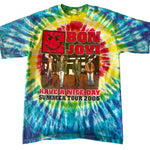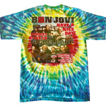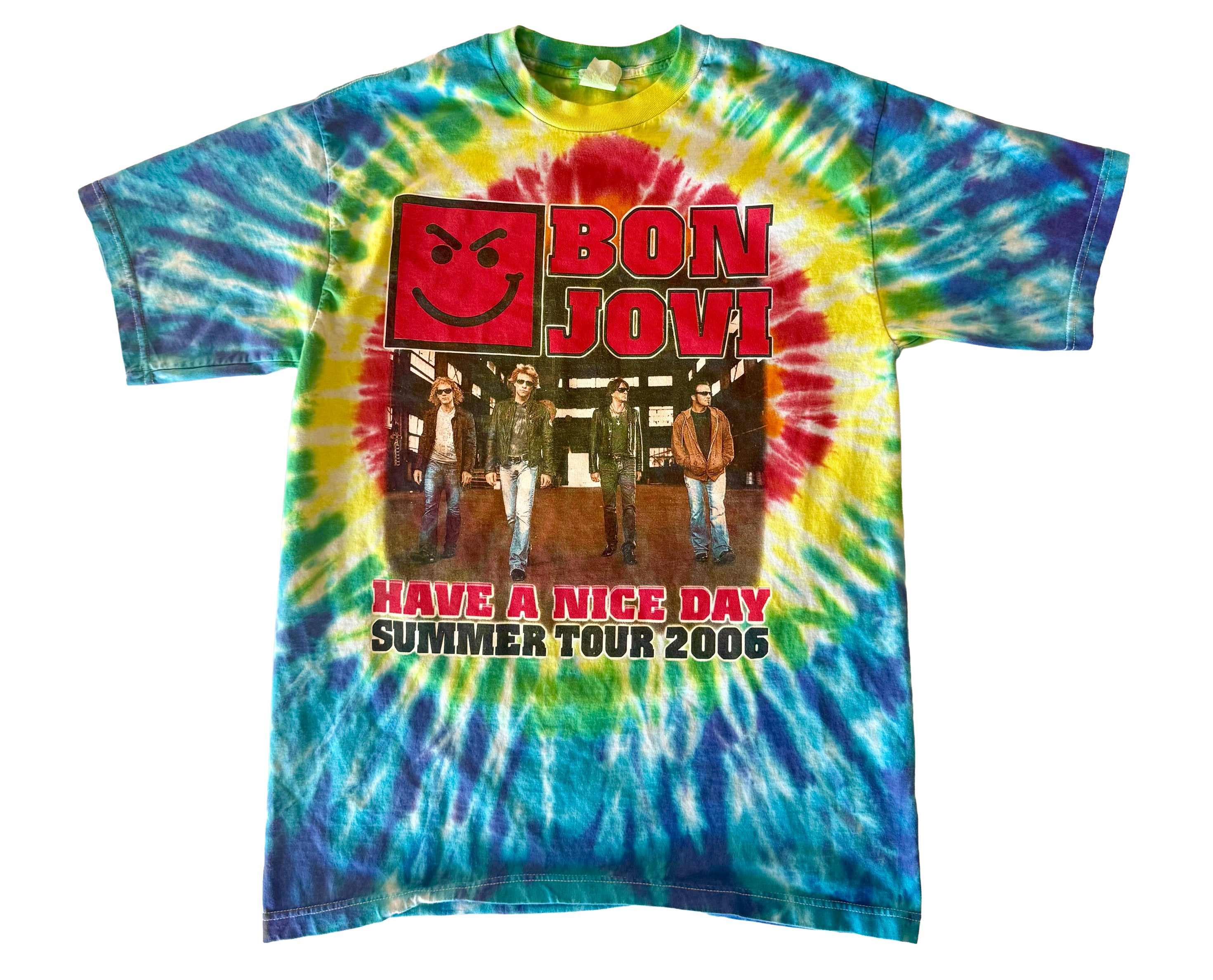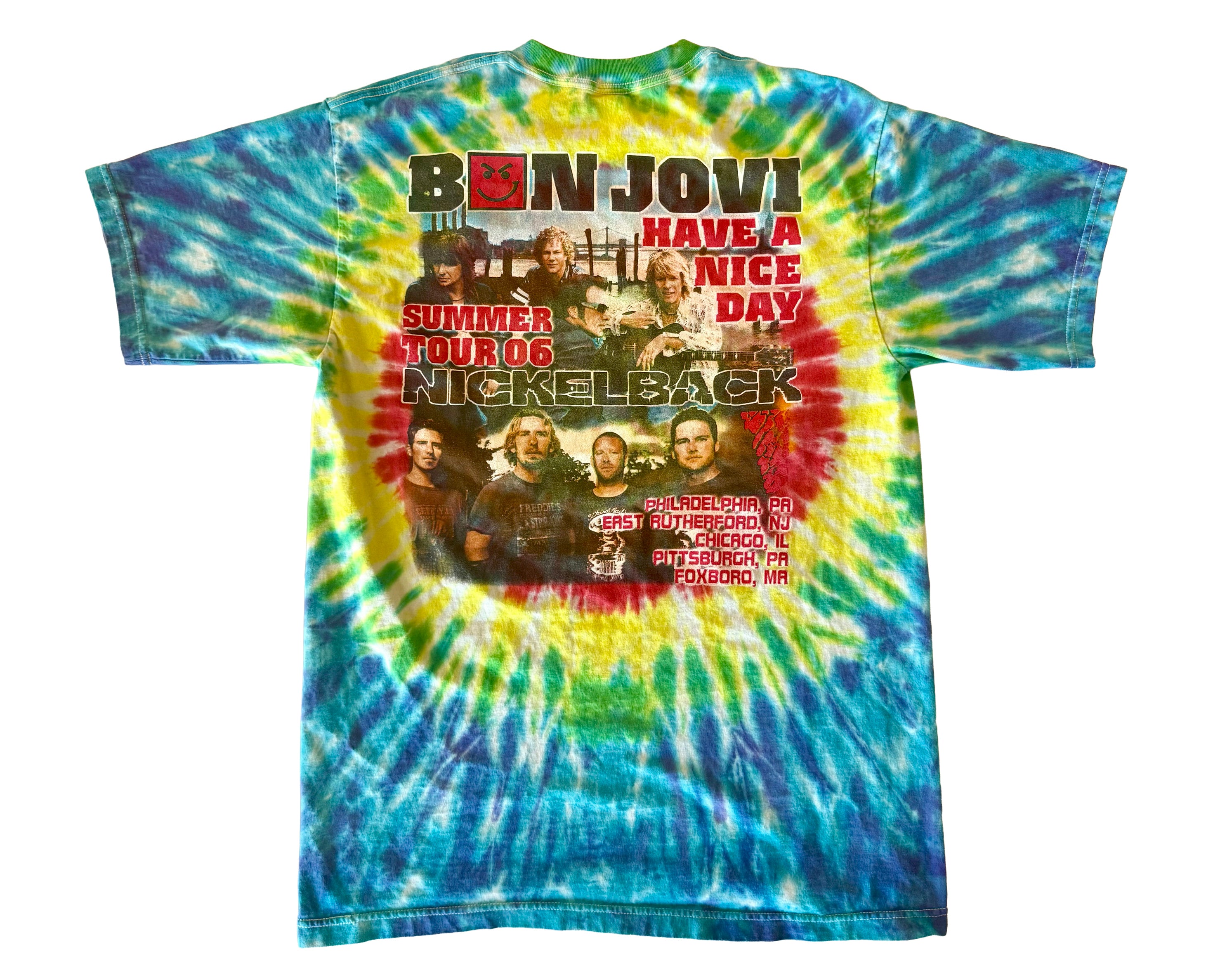 This Bon Jovi "Have a Nice Day" Summer Tour 2006 t-shirt is a vibrant piece of mid-2000s rock memorabilia. Featuring a bold tie-dye pattern in bright blues, yellows, greens, and reds, the shirt showcases Bon Jovi on the front with their classic smiley face logo from the Have a Nice Day era. The back highlights the 2006 summer tour dates, co-headlined with Nickelback, with stops in Philadelphia, Chicago, Pittsburgh, Foxboro, and more. Printed on a soft 100% combed cotton blank, the shirt has double-stitch construction, capturing the durability and style of the mid-2000s. With its colourful tie-dye design and iconic Bon Jovi graphics, this shirt is a standout collectible for fans of 2000s rock and bold concert fashion.