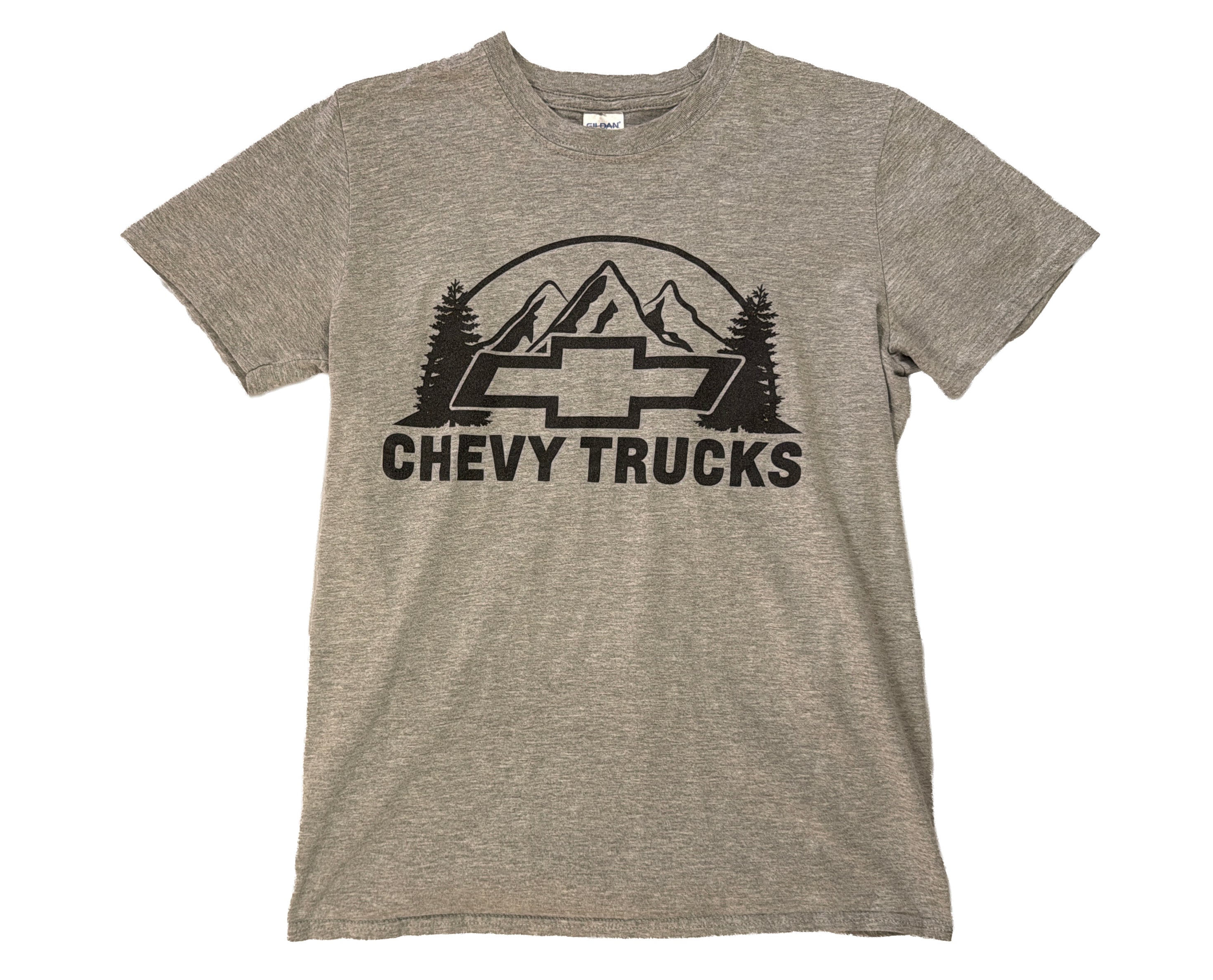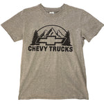 Chevy Trucks tee captures the rugged spirit of an American classic. The heather grey base carries a bold black print of the Chevrolet bowtie framed by mountains and trees, a nod to the brand’s reputation for toughness and outdoor grit. More than just a logo, it represents decades of truck culture and the enduring appeal of Chevy’s “Like a Rock” image that became iconic from the 1990s onward.
