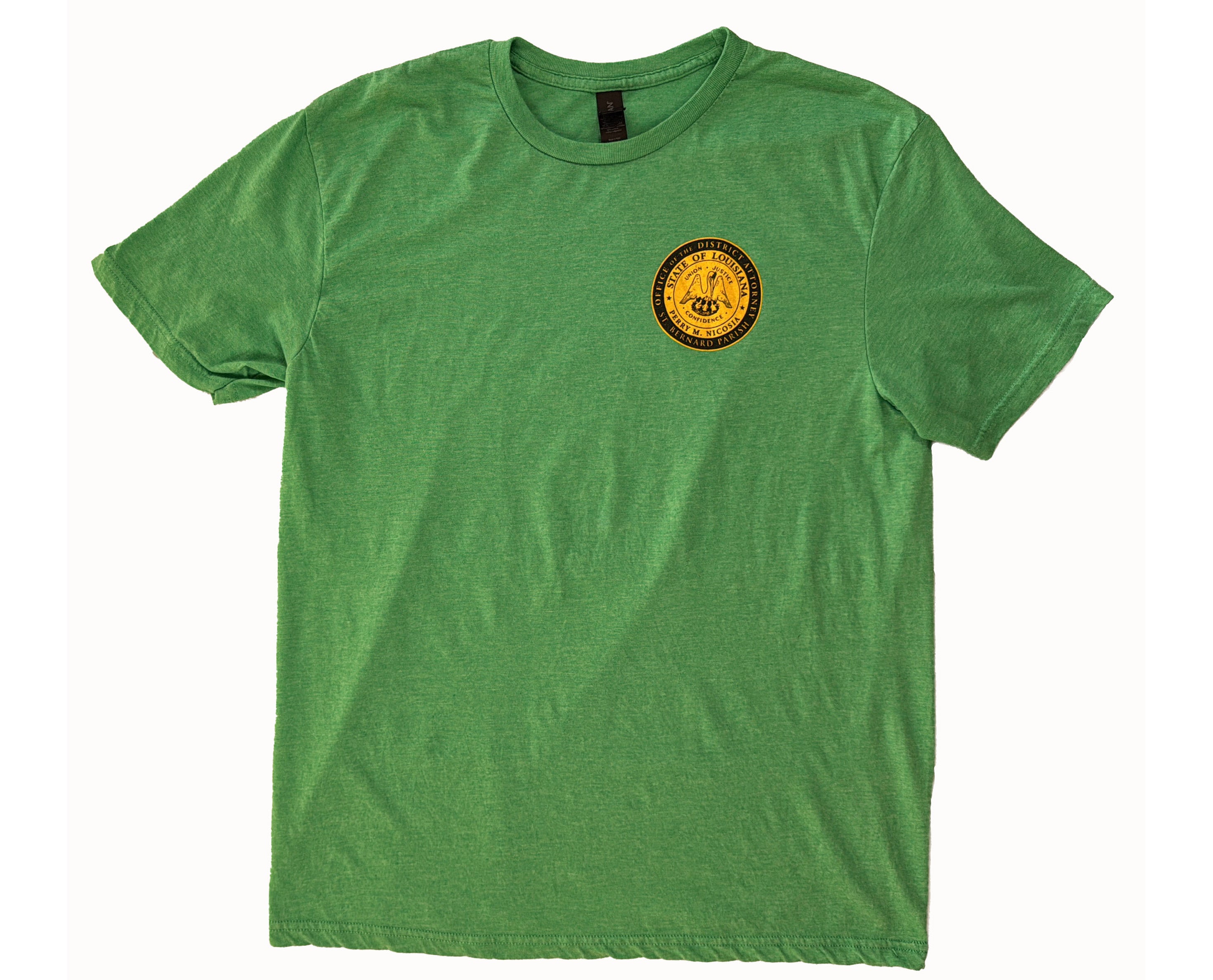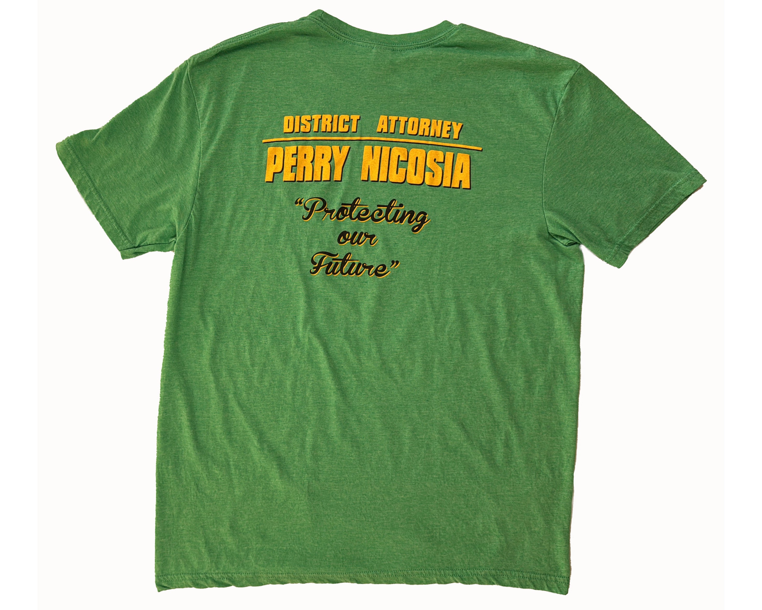 Represent the District Attorney’s office with this t-shirt, featuring the bold logo and the slogan "Protecting Our Future." This tee celebrates the important work of Perry Nicosia, who is dedicated to serving and protecting the community. The shirt showcases the District Attorney’s official logo on the front and the slogan, capturing the essence of the office’s commitment to the safety and well-being of its people.