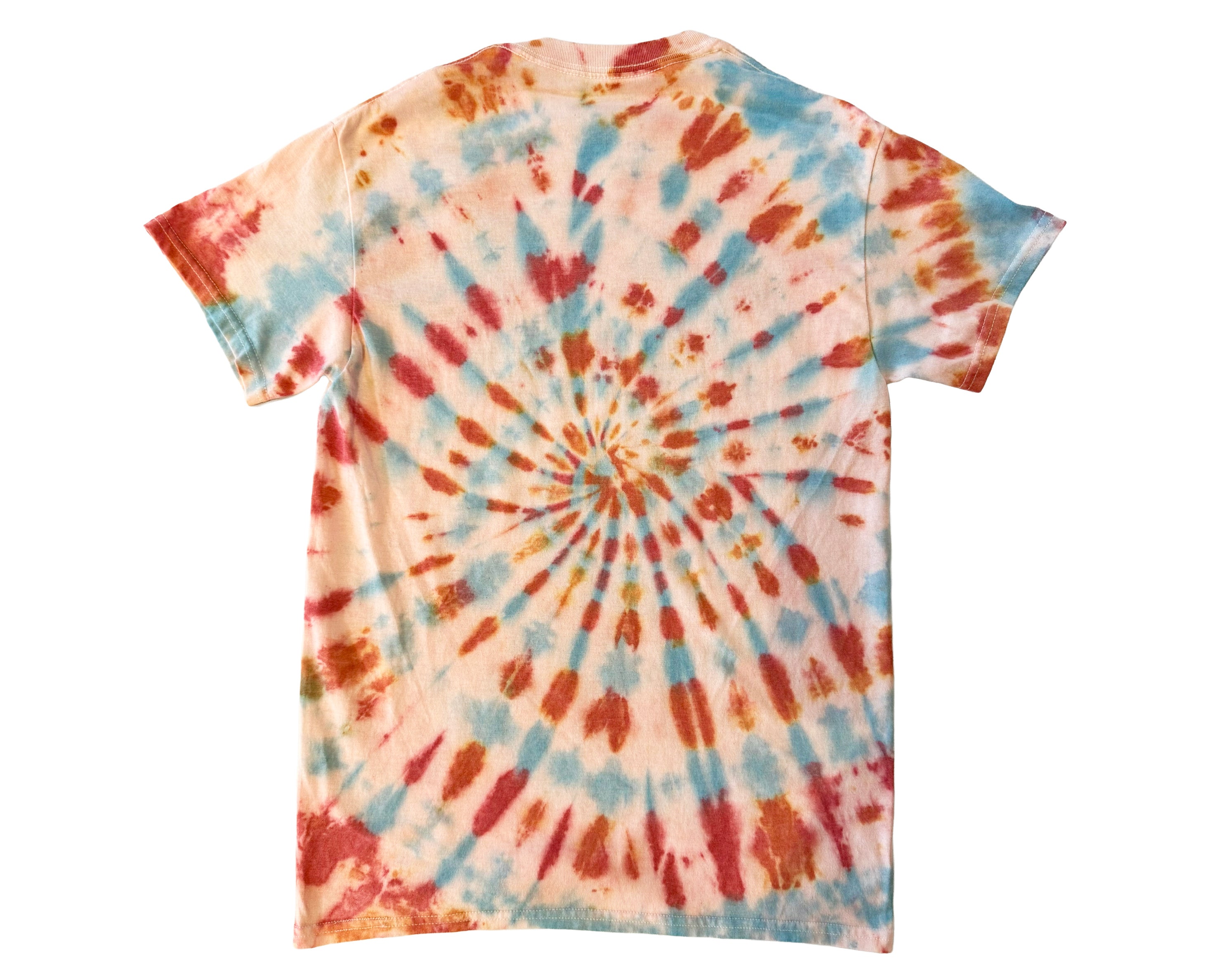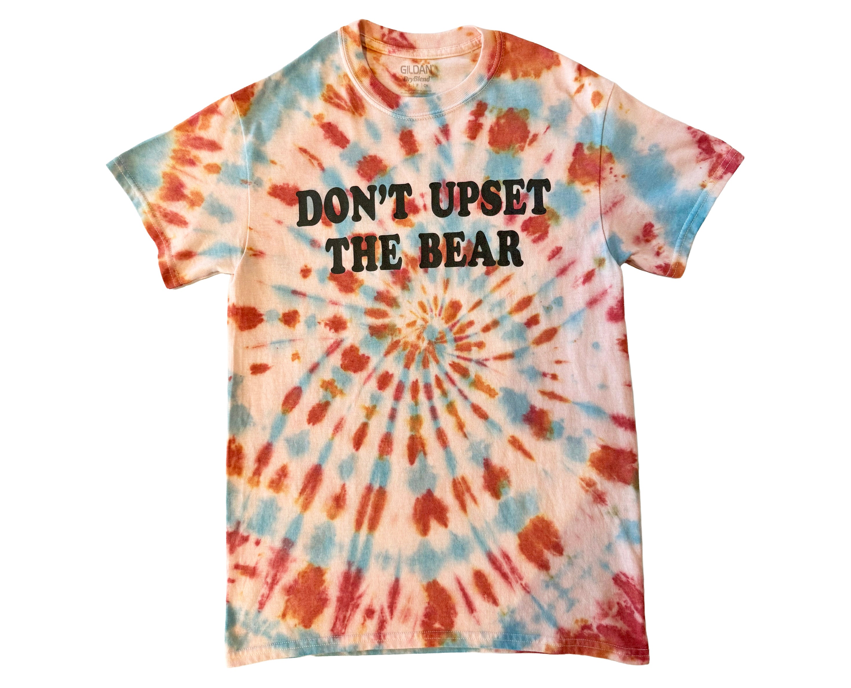 This tie-dye T-shirt is a true standout, featuring a bold spiral of red, blue, and golden hues that give it a vibrant, retro feel. On the front, the phrase “Don’t Upset The Bear” is printed in large black lettering, making it both playful and eye-catching. Made by Gildan in their DryBlend line, the shirt combines 50% cotton and 50% polyester for softness, durability, and breathability—perfect for everyday wear. The back continues the full spiral tie-dye pattern, giving it a 360° burst of colour that captures classic festival and streetwear vibes. With its slightly worn-in texture and character, this tee carries a sense of authenticity that makes it more than just a novelty piece. Sized small, but with a relaxed fit, it’s a versatile addition for those who love unique graphic tees with personality. Whether layered or worn on its own, it’s a shirt that knows how to make a statement.