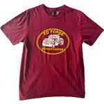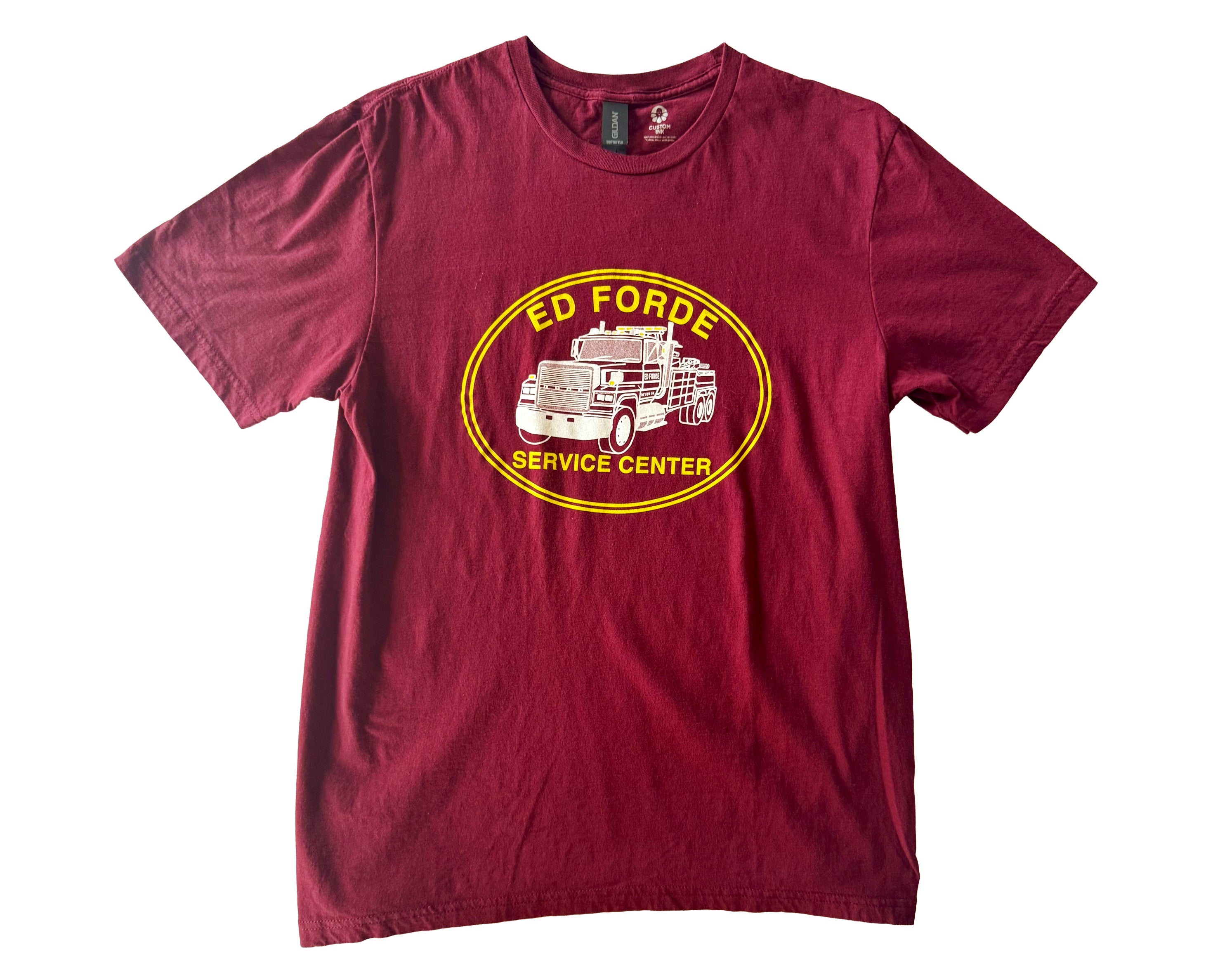 This Ed Forde Service Center T-shirt brings a touch of industrial grit to your collection. Printed on a deep red Gildan Softstyle tee, the bold yellow oval logo frames a detailed illustration of a heavy-duty truck—perfectly capturing the no-nonsense spirit of a working service centre. Made from 100% cotton, it offers a soft yet durable wear that balances comfort with everyday toughness. With its straightforward design and striking contrast print, this shirt feels like a piece of local history—merch that likely only made sense for the garage regulars and truck enthusiasts who knew the name. Today, it’s a rare and character-filled find that embodies both utility and personality. Whether you’re into Americana workwear, bold graphic tees, or simply enjoy the story behind the shirt, this one fits right in. A proper statement piece with just the right amount of attitude.