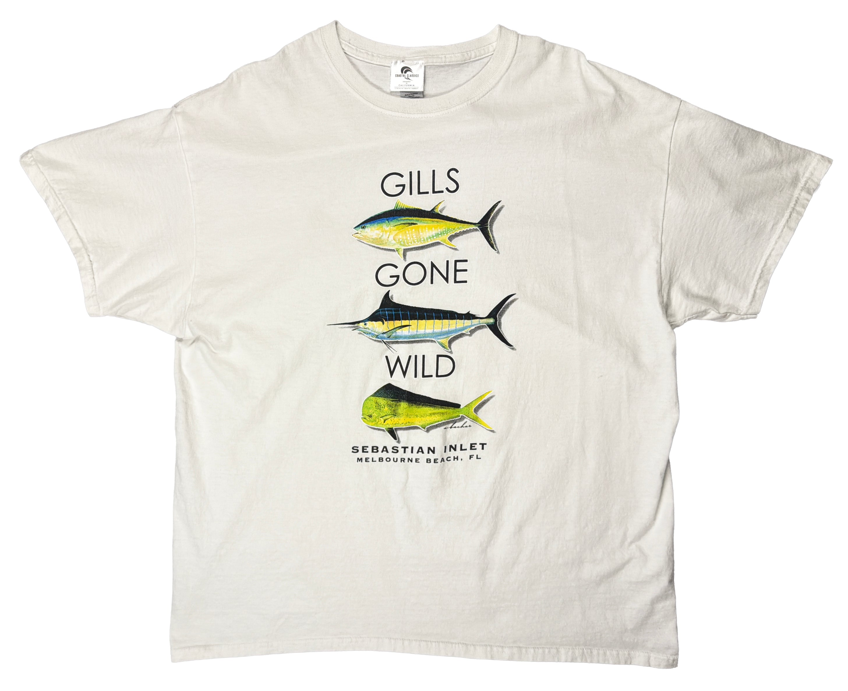 This Gills Gone Wild tee captures the spirit of Florida’s fishing culture with a playful twist. Featuring bold, full-colour graphics of three game fish—yellowfin tuna, marlin, and mahi-mahi—stacked vertically above the words “Gills Gone Wild,” it brings a bit of humour to the sport. Below, the shirt anchors itself in place and time with a reference to Sebastian Inlet in Melbourne Beach, Florida, one of the state’s premier fishing destinations.