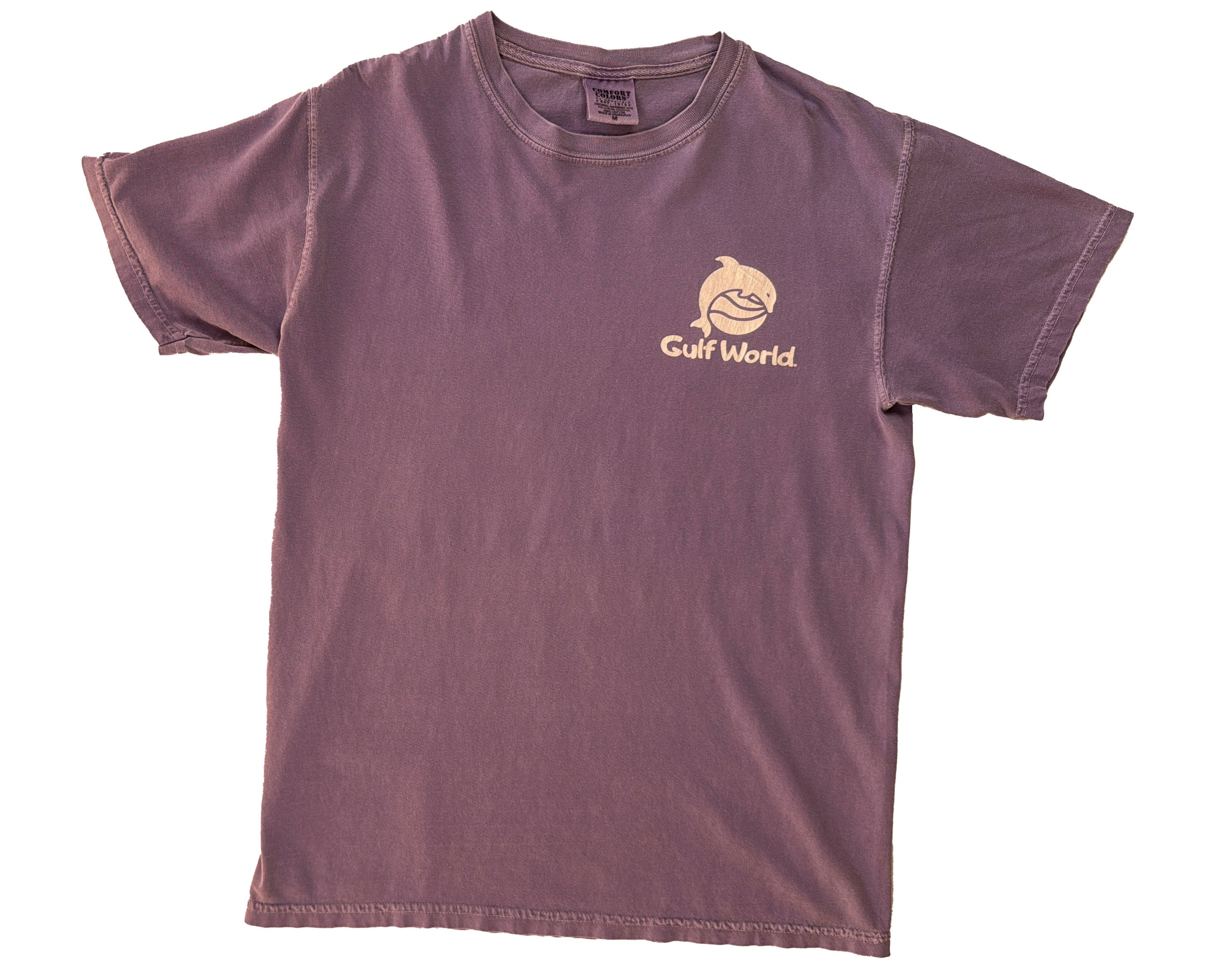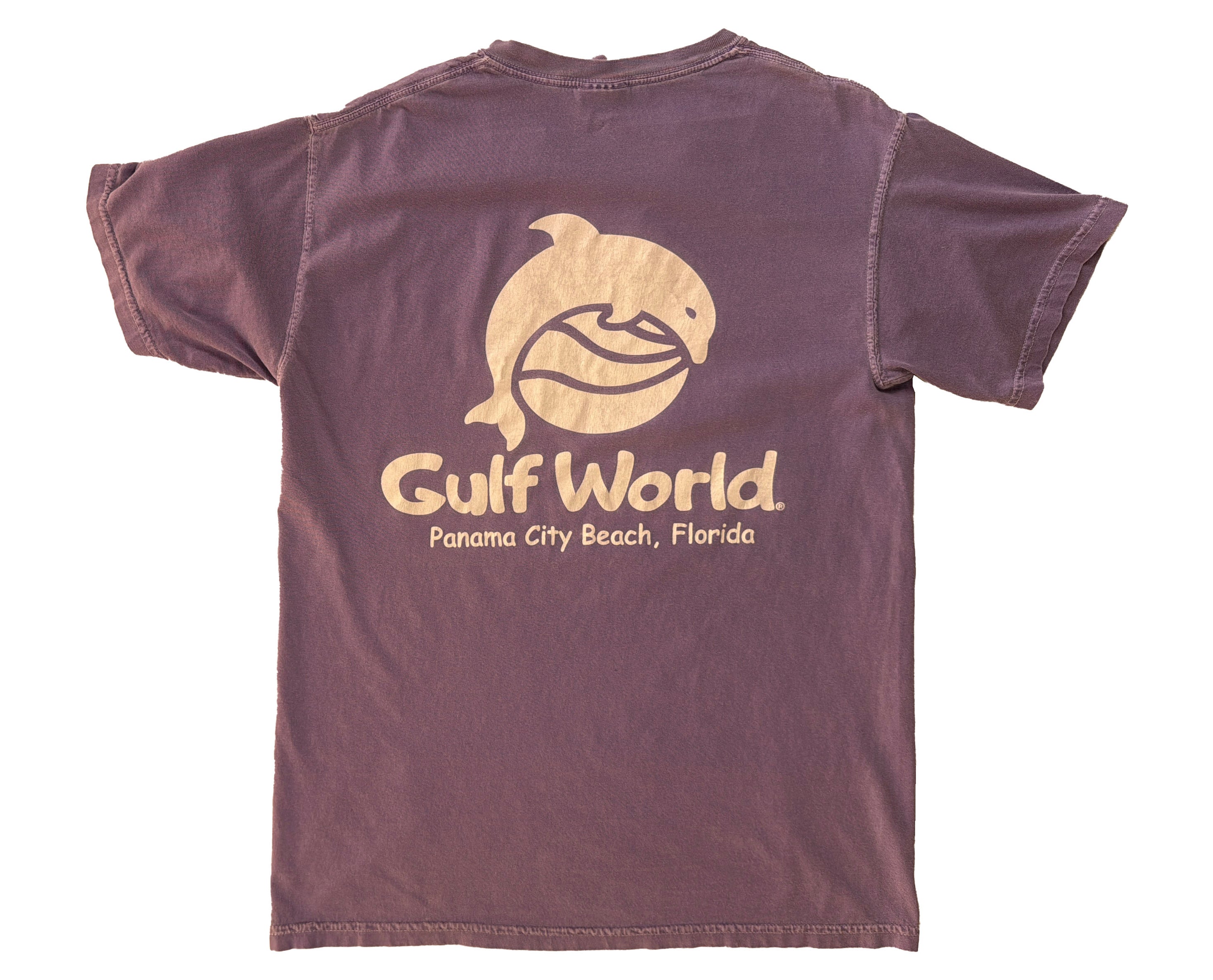Take a piece of Panama City Beach with you with this Gulf World t-shirt. This soft purple shirt features a fun dolphin logo on the front and back, representing the Gulf World marine park. Known for its interactive exhibits and marine life shows, Gulf World has long been a family favorite. The back of the shirt highlights the park's location in Panama City Beach, Florida. Crafted from 100% cotton, this shirt is both stylish and comfortable. The slight fading gives it a relaxed, vintage vibe, perfect for fans of marine life or anyone who cherishes memories of a beach vacation.