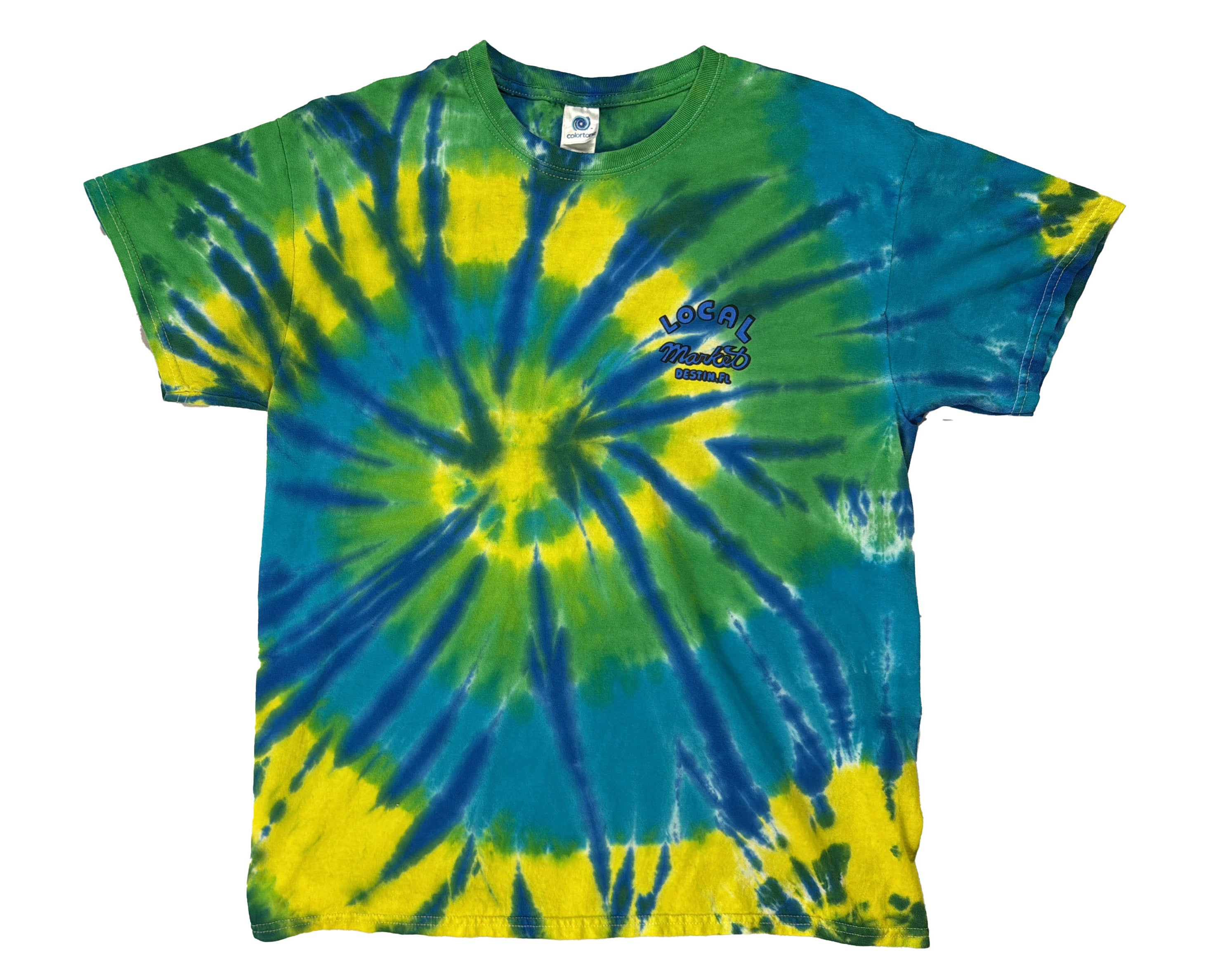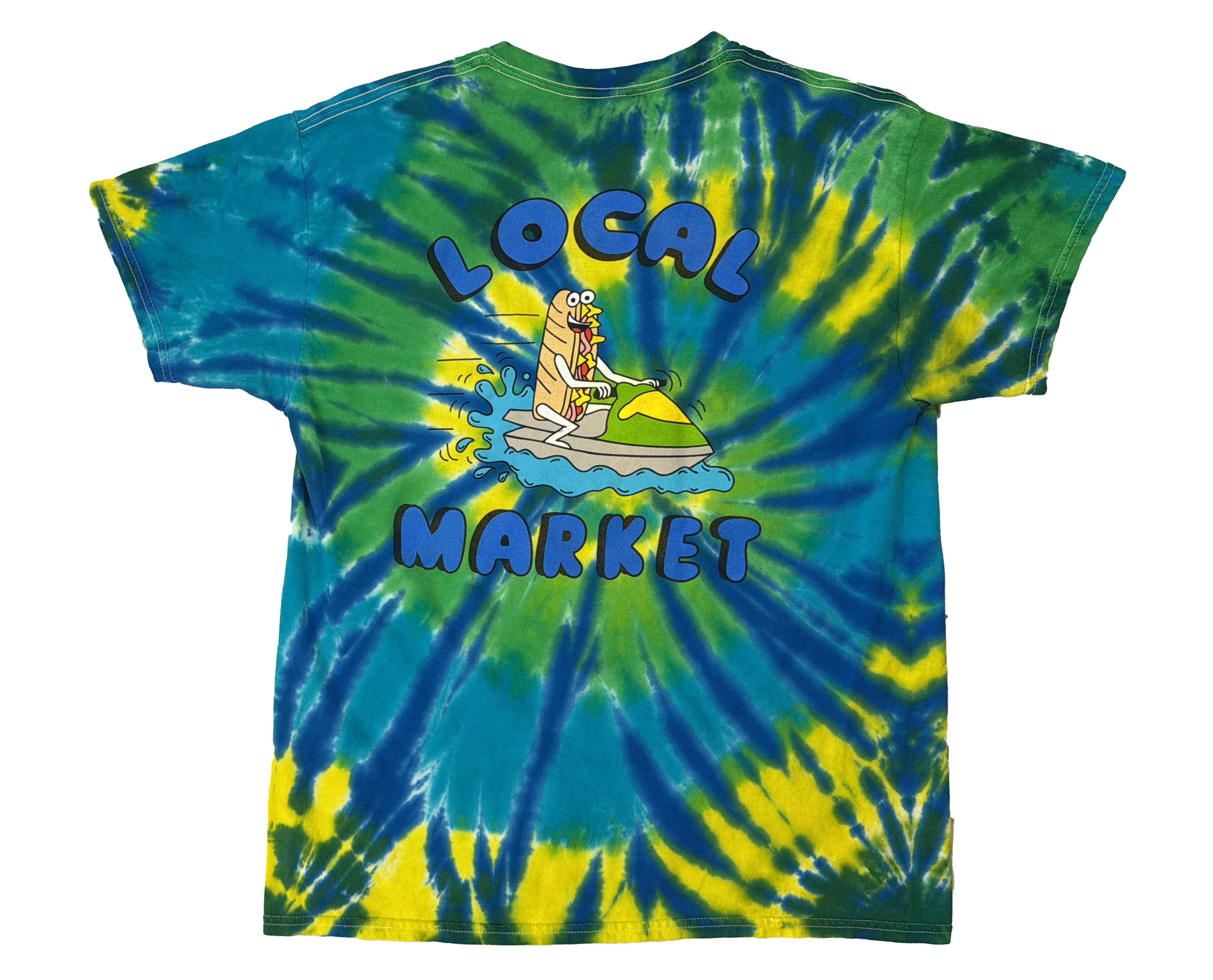 Take a dive into beachside vibes with this bright tie-dye tee from Local Market in Destin, Florida. Featuring a playful graphic of a hot dog on a jet ski, this shirt is an easy way to bring the spirit of fun and sun wherever you go. With vibrant green and blue hues splashed across the fabric, it’s the perfect way to show off your love for this laid-back beach town. Destin’s Local Market is all about good times, and this tee captures that energy perfectly, whether you're enjoying the local sights or just looking for a fun, quirky shirt to stand out. The “Local Market” logo on the front gives it that perfect local flair, reminding you of the cool, unique places you can only find on Florida’s Gulf Coast. Embrace the energy of the beach with this one-of-a-kind design—perfect for days by the water or summer nights on the town.