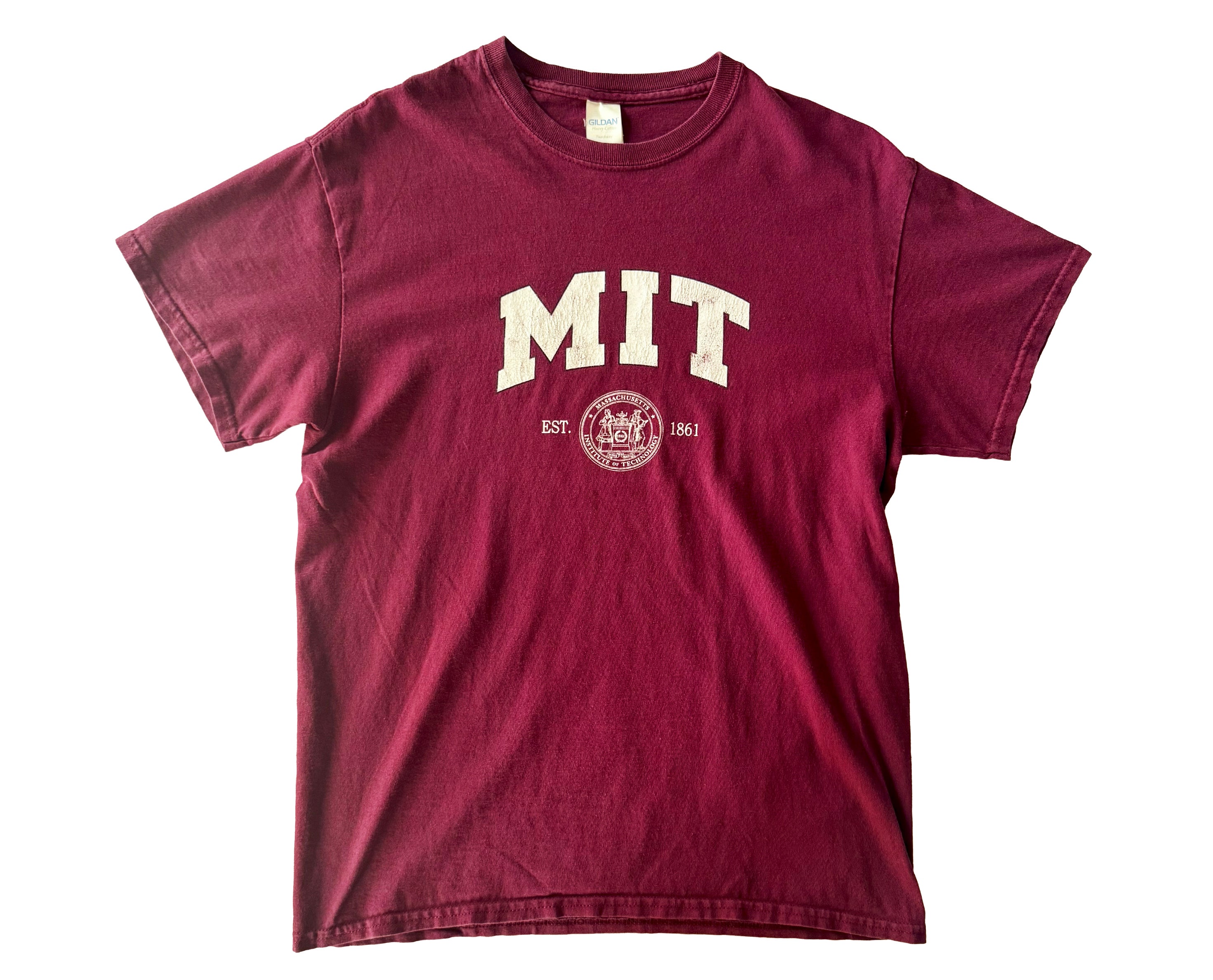 This maroon MIT T-shirt pays tribute to one of the world’s most prestigious institutions, the Massachusetts Institute of Technology, founded in 1861. Featuring the bold MIT lettering across the chest with the official seal beneath, it’s a classic collegiate look that represents innovation and excellence. Made from 100% cotton by Gildan, the shirt offers comfort and durability, perfect for everyday wear. The deep red tone and straightforward design make it versatile, whether styled casually or as part of a layered look. Ideal for those who appreciate iconic American universities and their global influence, this tee is a timeless staple.