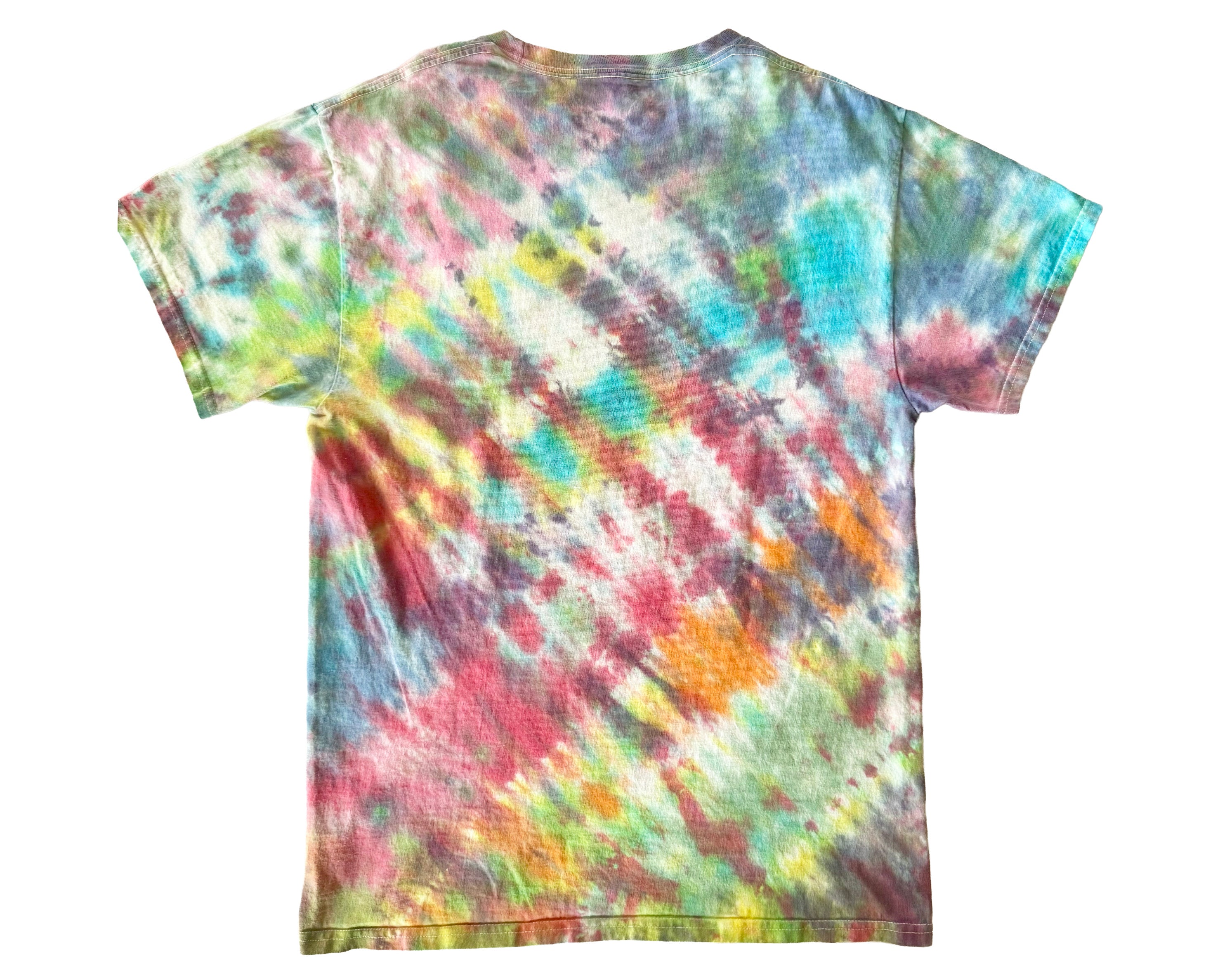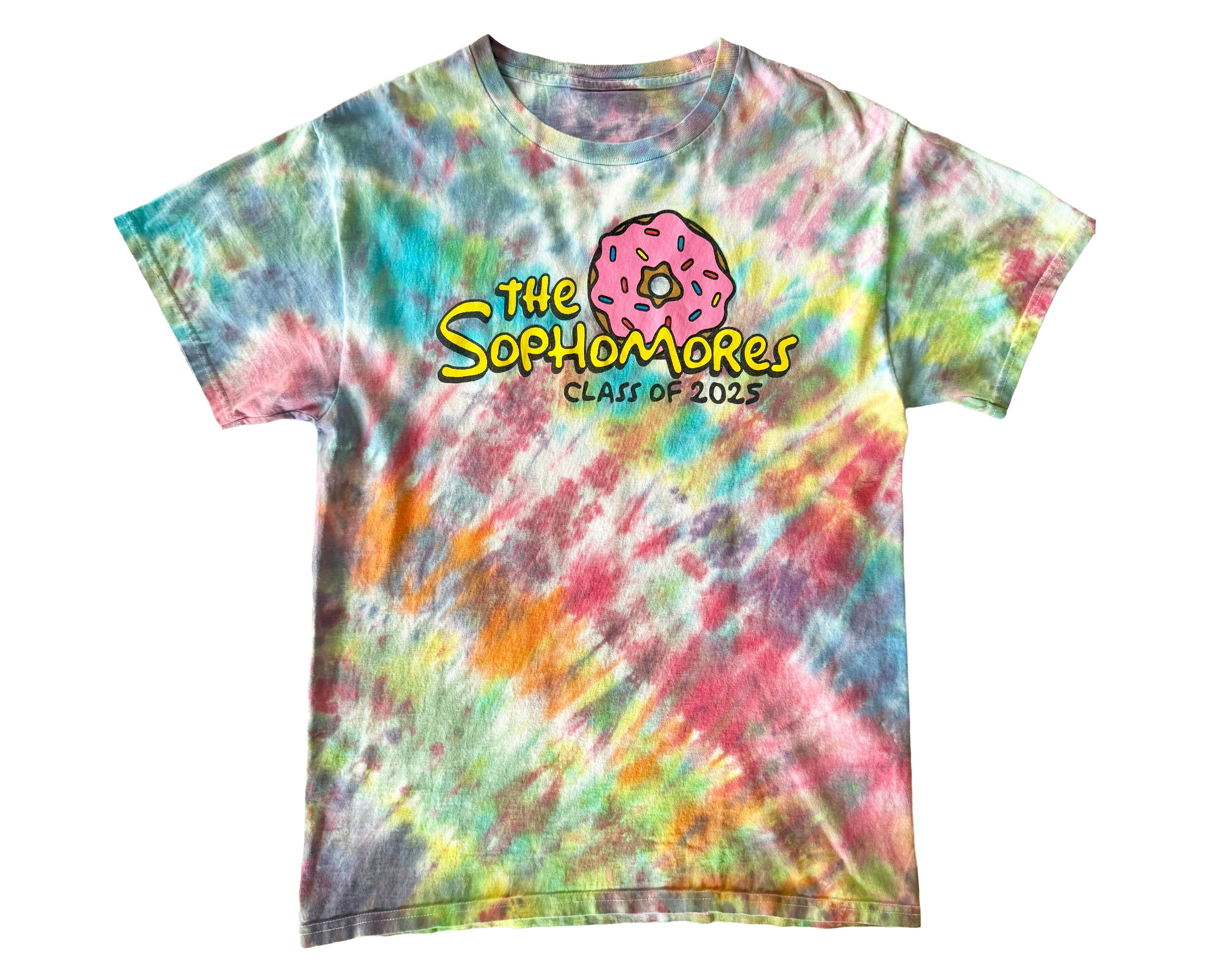 This bold tie-dye tee brings colour and humour together with a playful nod to The Simpsons. Featuring a pink frosted doughnut graphic and “The Sophomores Class of 2025” text, it blends classic cartoon-inspired fun with modern student culture. The rainbow swirl tie-dye makes each piece unique, with a spectrum of bright tones across the fabric. Made from 100% cotton, the shirt has a comfortable feel and casual fit, perfect for everyday wear or as a standout piece in any collection. While not decades old, it’s a one-off design that carries a nostalgic vibe, bridging pop culture parody with student identity. The hand-dyed look ensures no two shirts are the same, giving it that authentic, worn-in personality collectors and style enthusiasts appreciate. A piece that’s both cheeky and vibrant, this tee is perfect for anyone who loves tie-dye, cartoon references, and playful statement style.