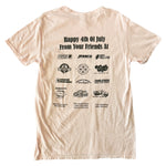 Made from 100% cotton by Threadfast, the shirt offers a comfortable fit with durable double stitching. The back showcases a range of local sponsor logos with a “Happy 4th of July” message, anchoring the design in its community roots. Lightweight yet sturdy, it’s ideal as a statement piece, casual wear, or a conversation starter.