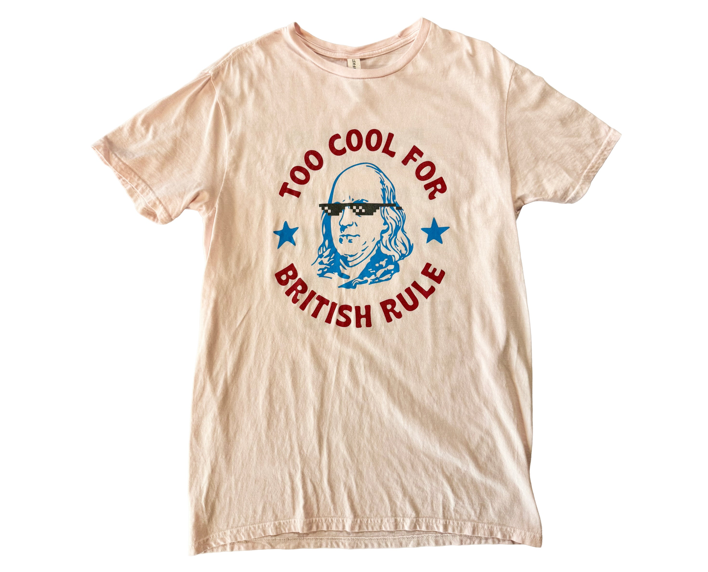 This Too Cool for British Rule T-shirt blends humour with history, featuring Benjamin Franklin in pixelated sunglasses for a cheeky twist. Printed in bold red and blue on a soft pink cotton base, it nods to American independence while keeping the design playful and modern. Originally tied to Fourth of July celebrations, the tee captures a spirit of irreverence that makes it stand out well beyond the holiday.