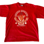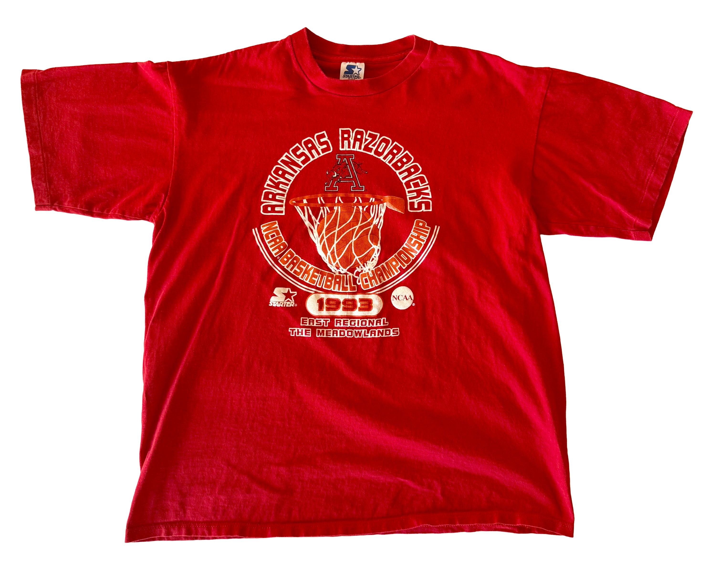 Celebrate a piece of Razorbacks history with this vintage 1993 Arkansas NCAA Basketball Championship T-shirt. Produced for the East Regional games at the Meadowlands, this bold red Starter tee captures the energy of the team’s unforgettable run. The front design features a large basketball net graphic with the iconic Razorbacks “A,” framed by bold collegiate lettering and official NCAA and Starter branding.