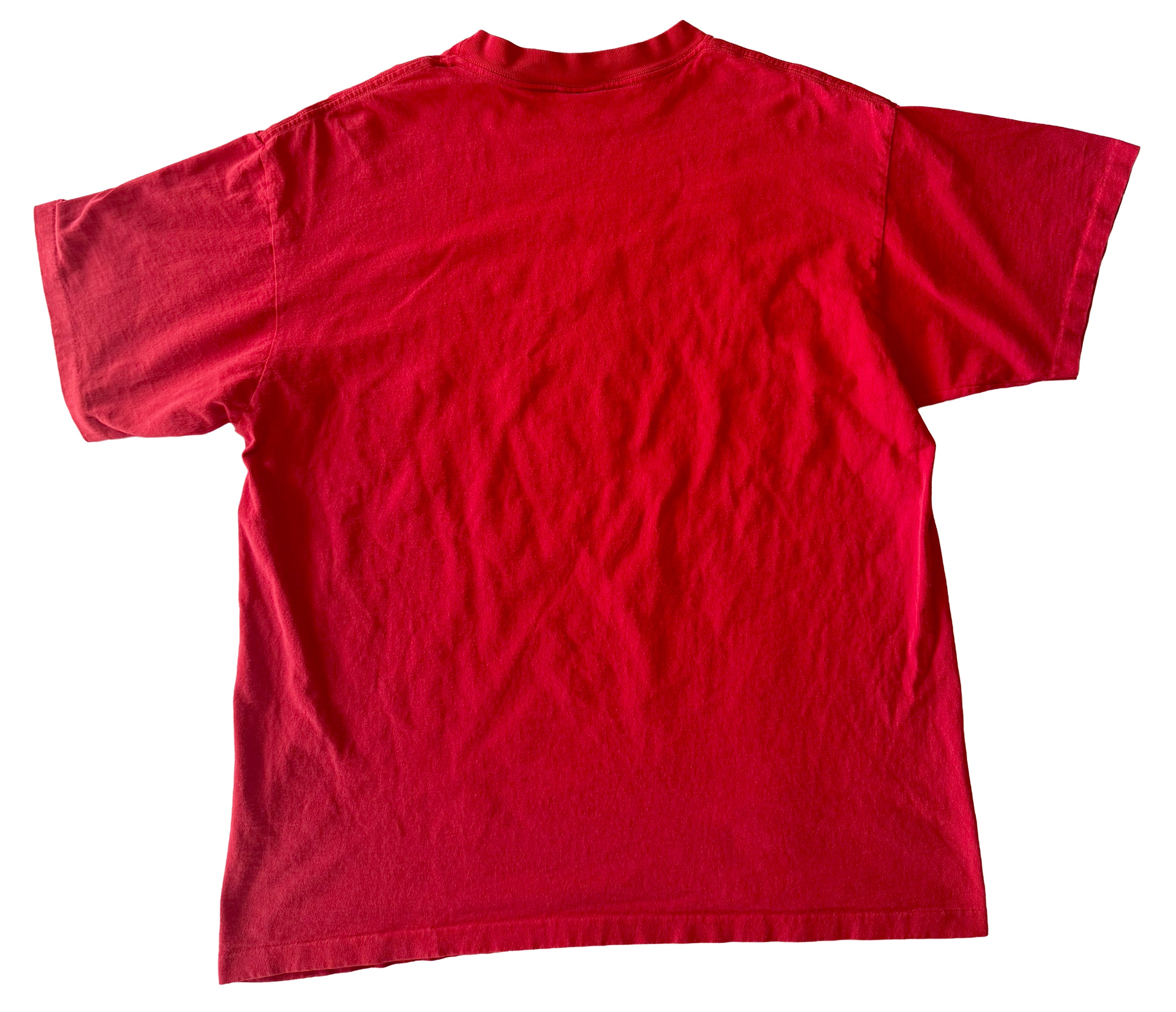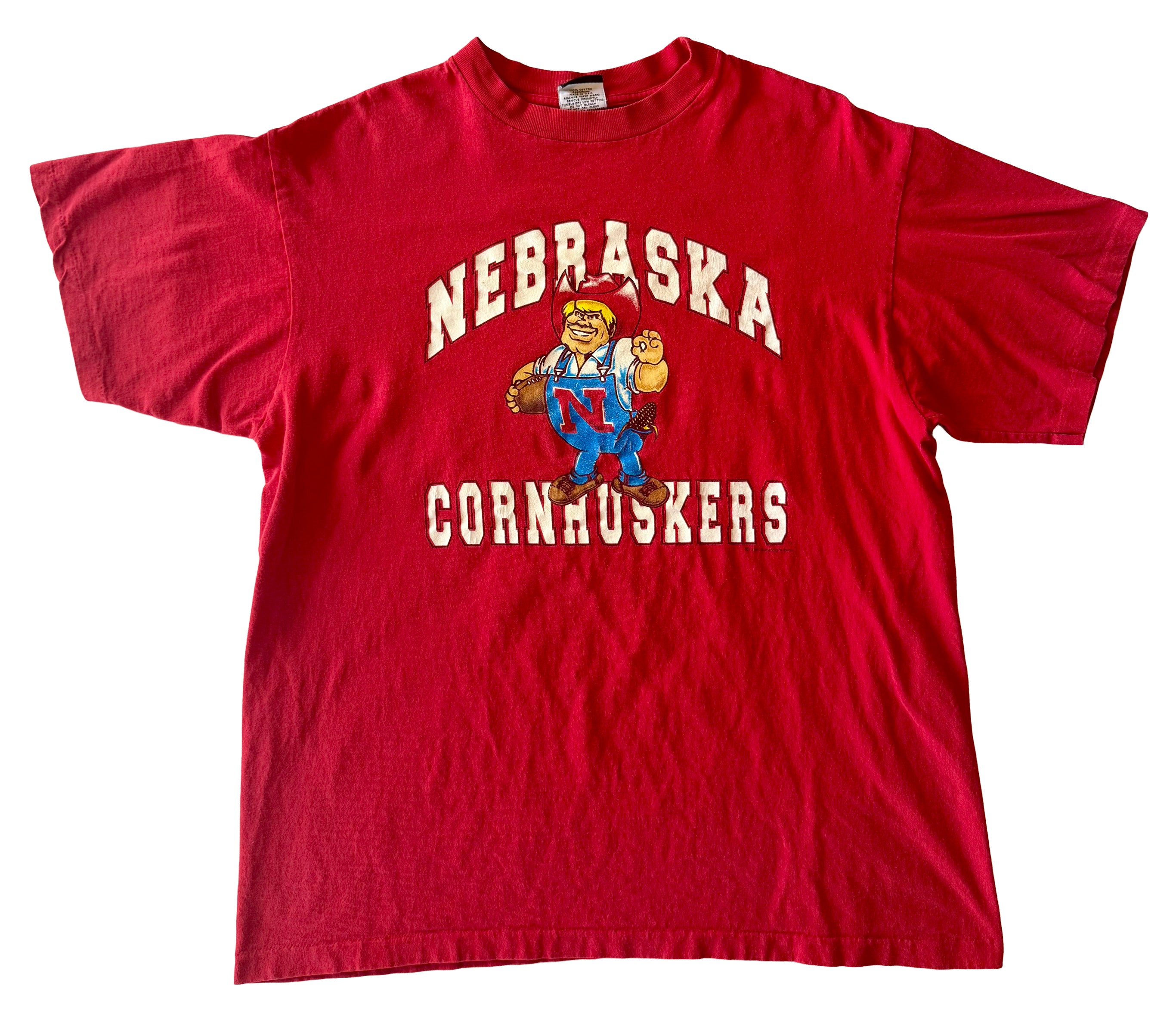 This vintage 1990s Nebraska Cornhuskers t-shirt is a bold piece of college sports history. Featuring the classic Cornhuskers graphic mascot proudly displayed across the chest, it embodies the energy and pride of Nebraska athletics. Printed on a vibrant red Signal Sports blank, the shirt is made from 100% preshrunk cotton, ensuring durability and a comfortable, lived-in feel. Its single-stitch construction and Made in USA origin mark it as an authentic piece from the golden era of sportswear. With its oversized fit and timeless collegiate style, this tee is perfect for Cornhuskers fans, sports collectors, or anyone seeking a standout vintage look. A true gem for those who appreciate 90s sports apparel and classic American-made quality.