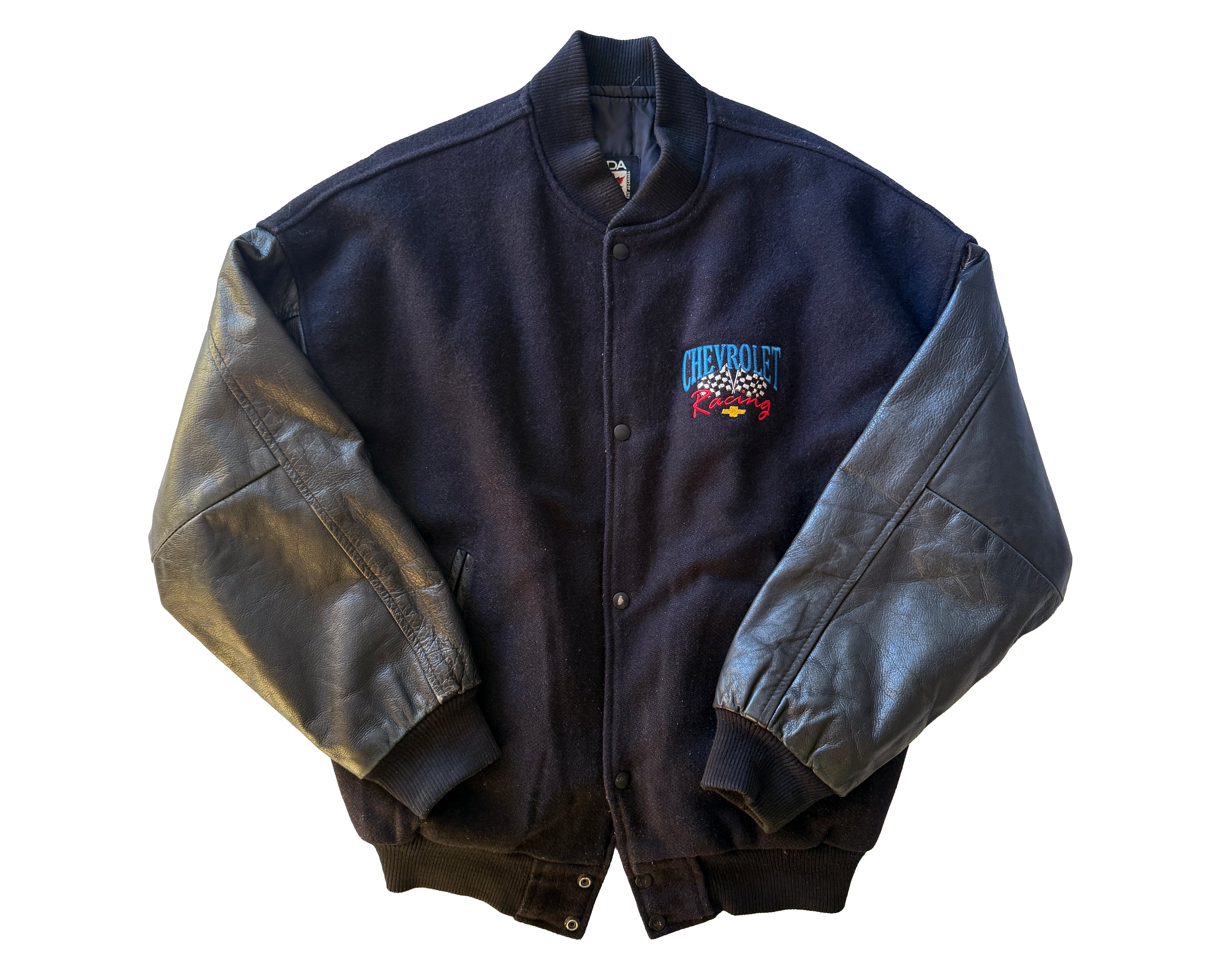 This Chevrolet Racing jacket brings a bit of old-school motorsport swagger into everyday life. Likely from the 1990s, it blends a heavyweight wool body with proper leather sleeves, the sort of construction you’d see trackside when racing teams favoured gear built to last. The front carries a neat Chevrolet Racing patch, while the back goes full throttle with a large embroidered logo framed by a pair of chequered flags. It has that unmistakable American racing attitude without feeling costume-y, making it easy to wear with jeans, boots or whatever you throw on for the day.