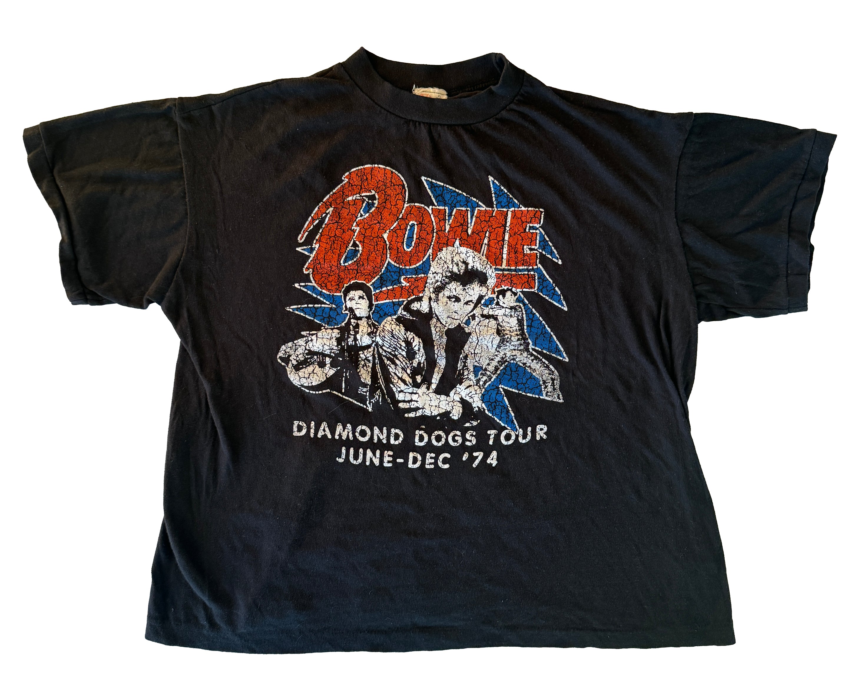 The Diamond Dogs tour was famously ambitious, packed with elaborate staging and a storyline that blurred theatre and rock performance. Original merch from this era was extremely limited, and even fantasy-label tour tees from the ’80s and ’90s have become heavily sought after because the imagery is just that iconic.
