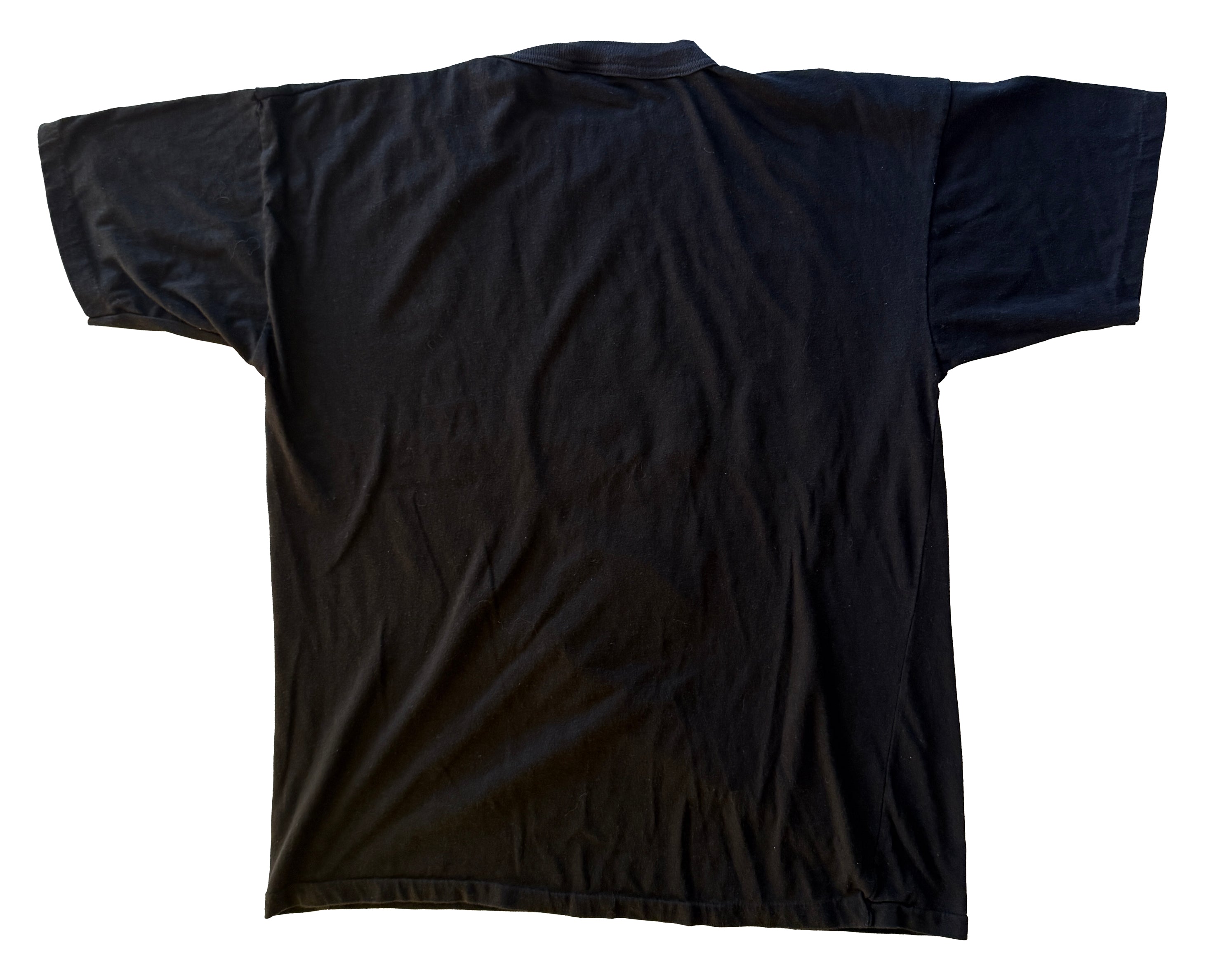 The shirt is printed on a TopTee poly-cotton blend, which gives it that lightweight, soft-drape fit that older tees are loved for. The single-stitch construction confirms true 1980s vintage, and decades of wear have softened the black fabric into that easy, relaxed texture collectors look for.