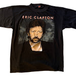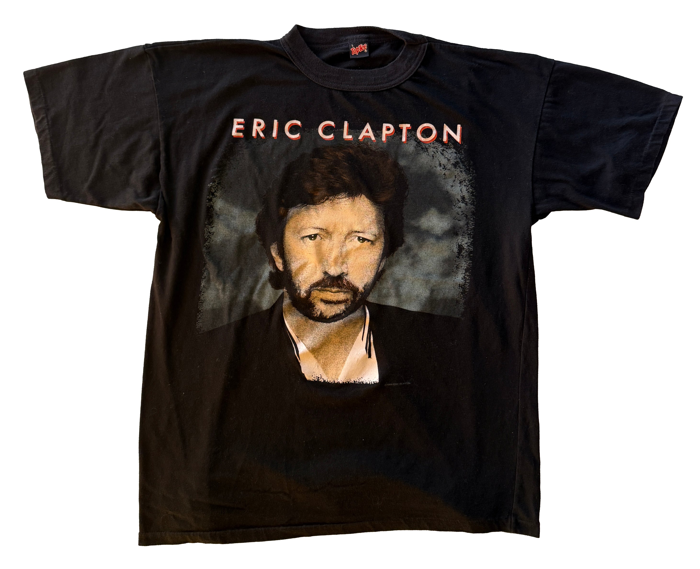 This original 1988 Eric Clapton tee captures a great moment in his late-’80s era, when the sound was shifting toward smoother blues-rock while still carrying the edge of his earlier work. The front features a large, soft-fade portrait printed in muted tones, set against a cloudy background that gives the graphic a moody, atmospheric feel — very much in line with late-’80s concert merch design. It’s simple, bold, and instantly recognisable.