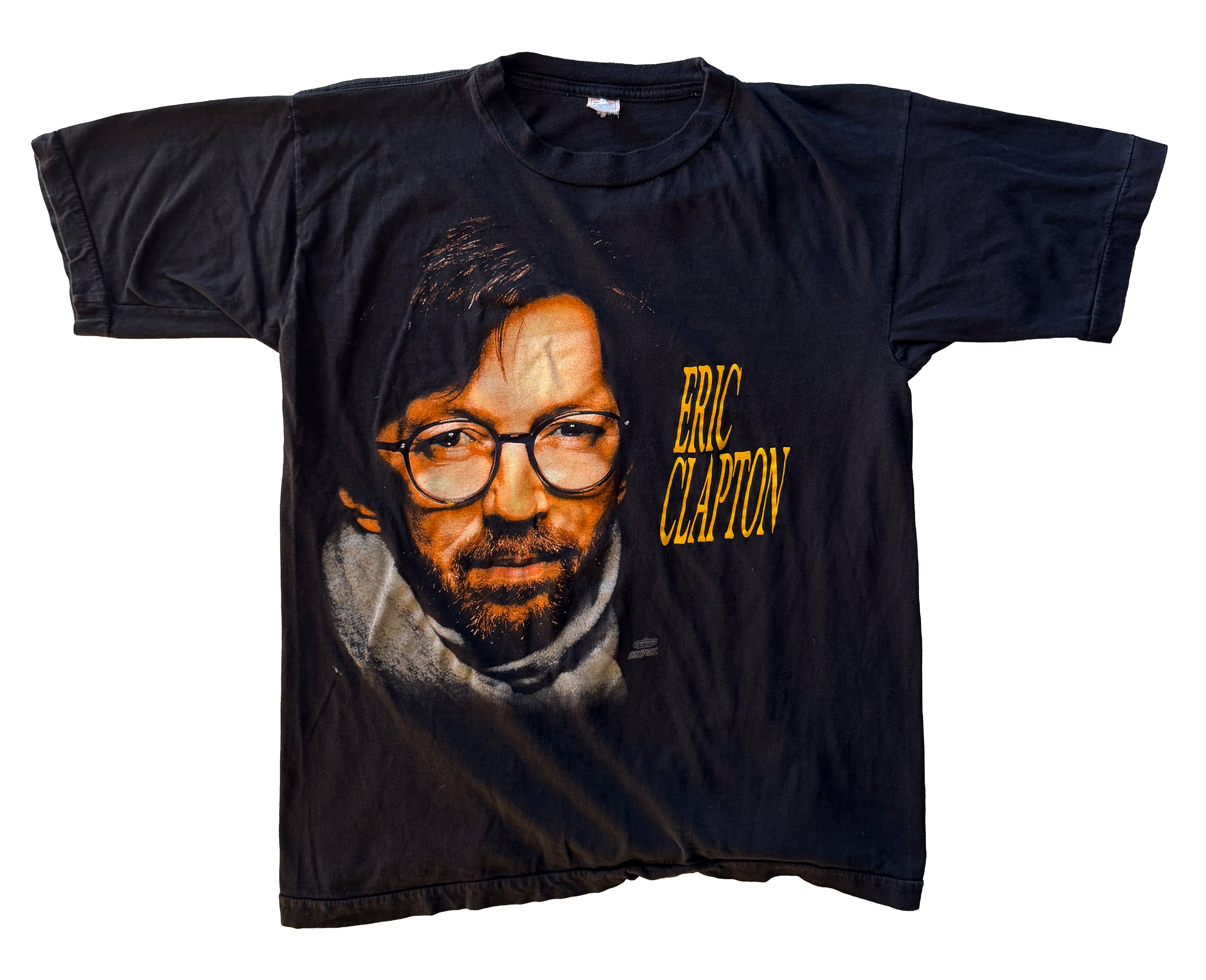 This original 1992 Eric Clapton UK Tour tee is a gem from the early ’90s touring era, carrying that unmistakable soft fade and oversized portrait style that defined band merch of the time. The front features a large, warm-toned image of Clapton in glasses and scarf—classic early-’90s Clapton, during a period where the sound was mellowing into blues-heavy guitar work and more reflective songwriting.