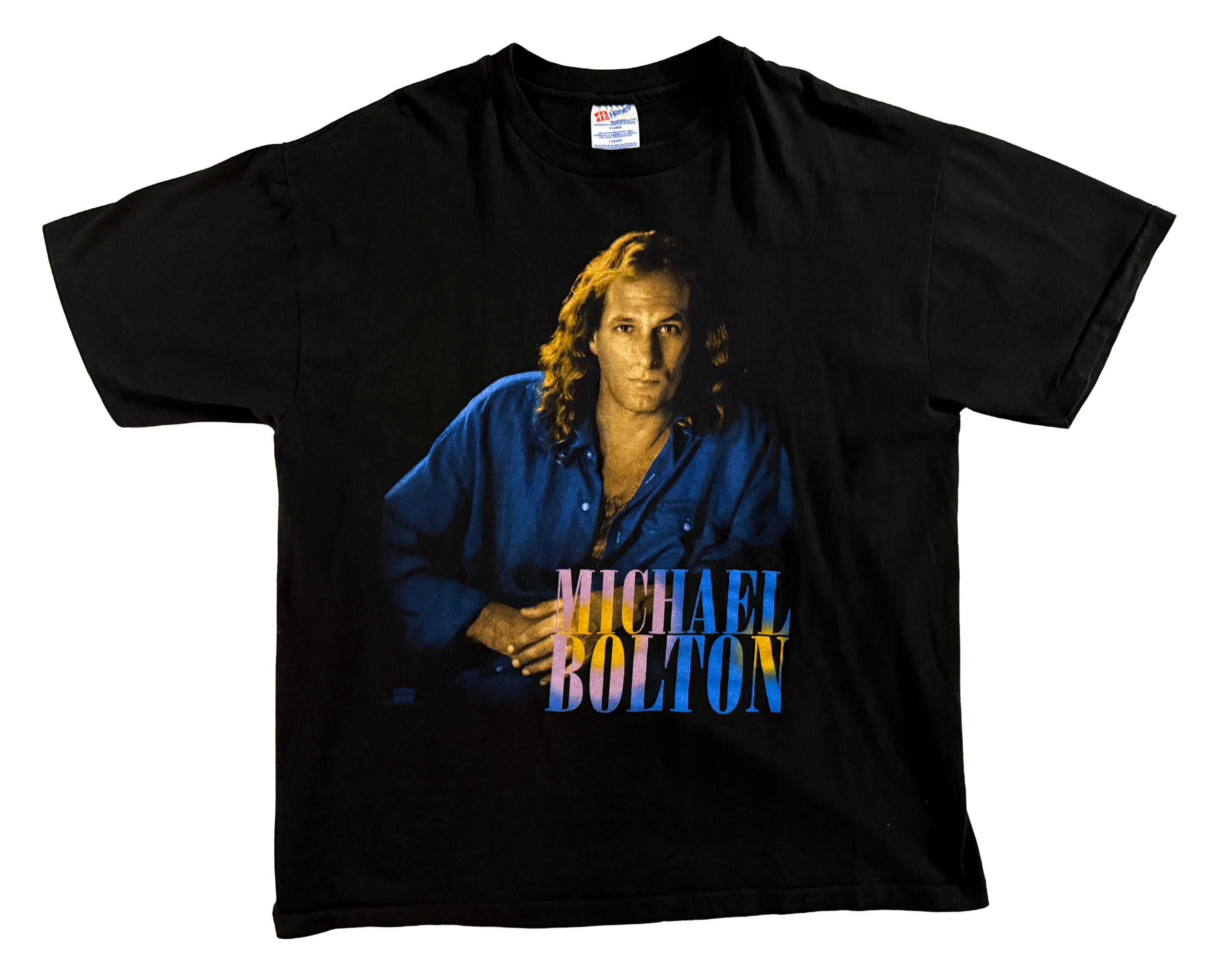 This original Michael Bolton World Tour 1994 t-shirt is a genuine mid-90s concert piece, produced during the height of his global popularity. Made in the USA on a Hanes tag from 100% preshrunk cotton, it features a large, high-quality front graphic portrait with Michael Bolton’s name in bold colour print, paired with a clean back hit reading “Michael Bolton World Tour 1994.” The black base has aged well, with strong colour saturation and no cracking or fading to the print, which is increasingly hard to find on tour tees of this era. Cut in a classic boxy 90s XL fit, it wears oversized by modern standards and works just as well styled casually as it does as a collectible music piece. A solid example of authentic 90s tour merchandise from a major artist, and a great crossover piece for both vintage music and pop-culture collectors.