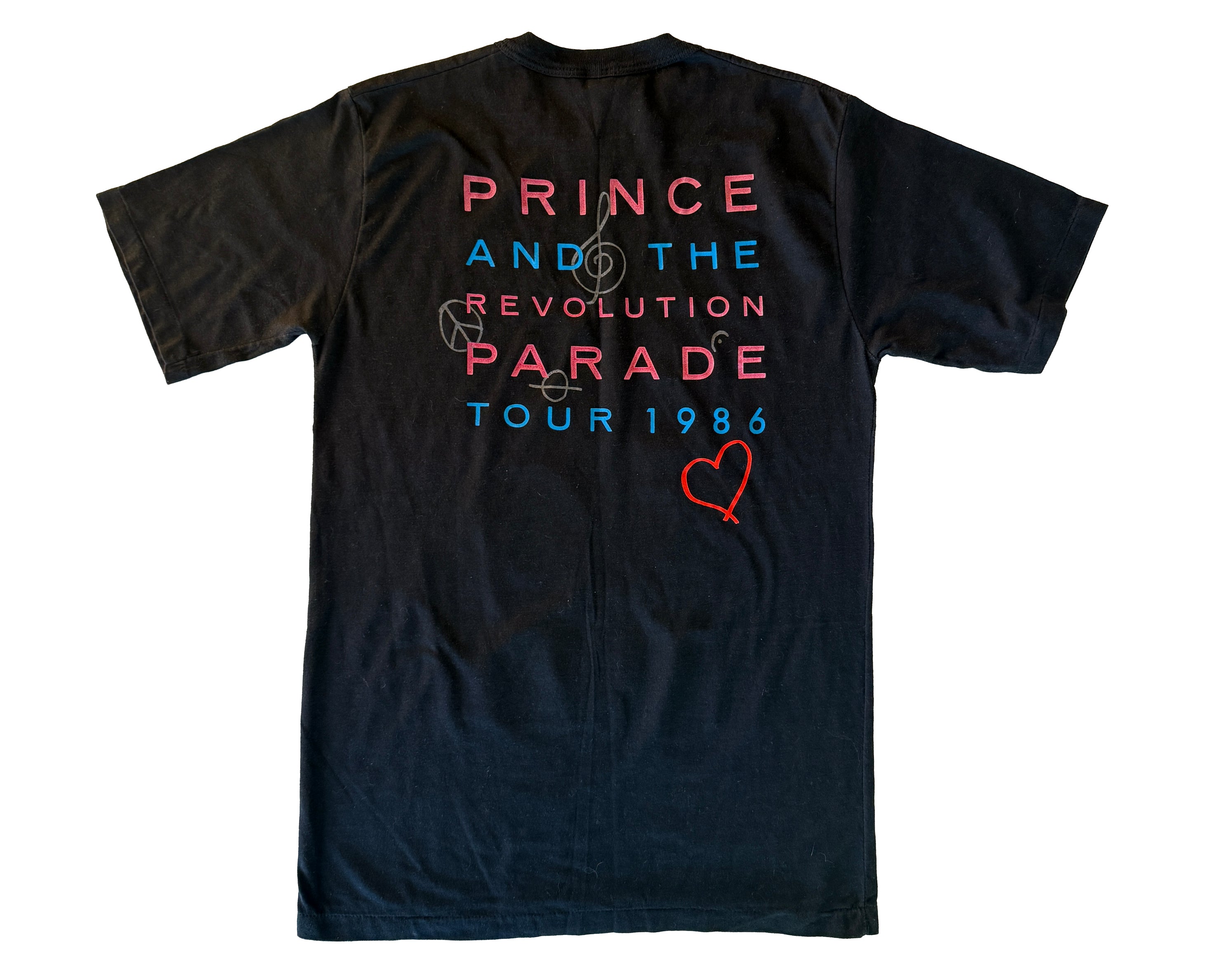 The back keeps things clean with the Parade Tour 1986 typography in bright pink and blue, finished with subtle musical-note detailing. It’s simple but unmistakably vintage, capturing the feel of a tour that only ran select dates and remains one of his shortest, making original merch particularly hard to find.