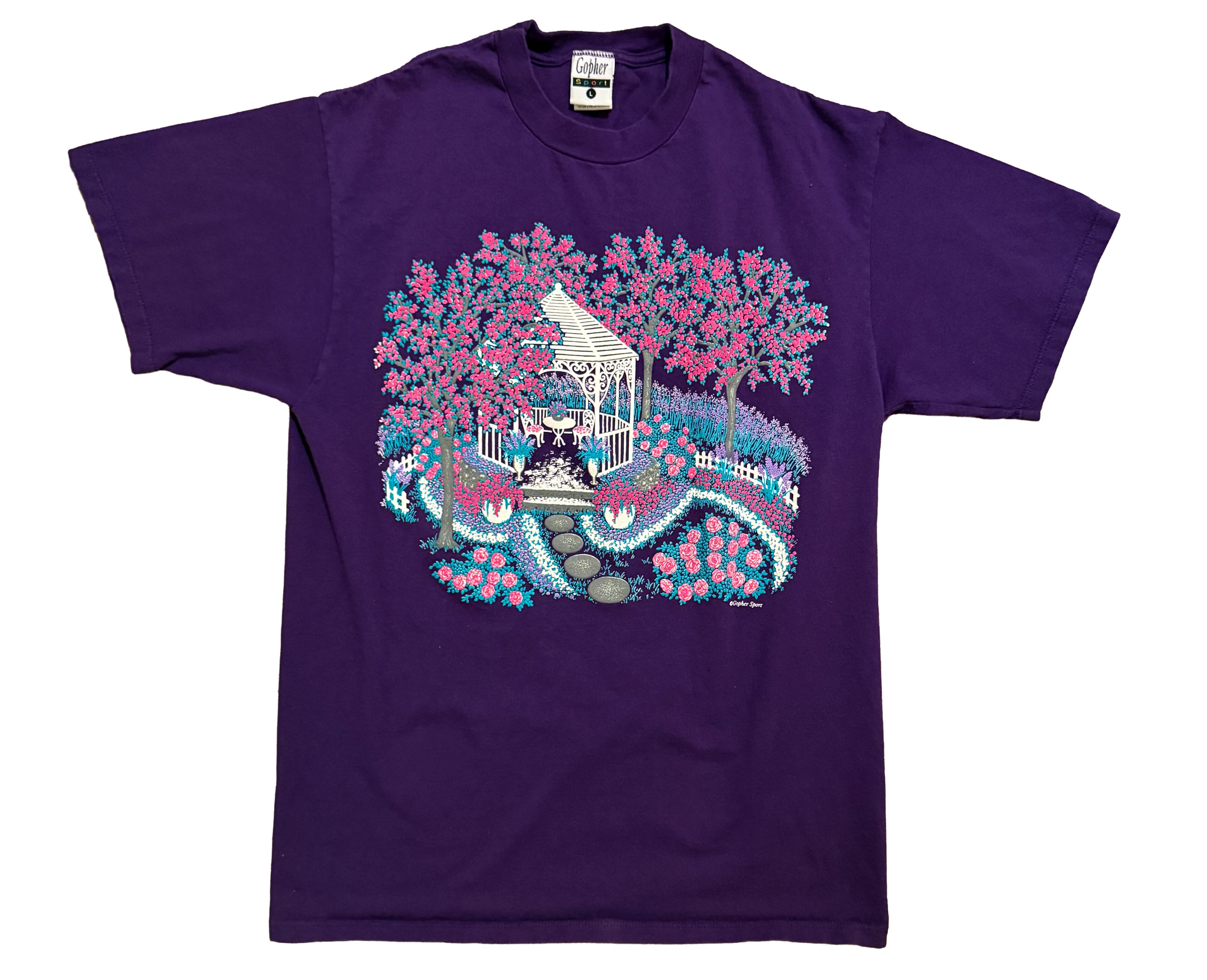 This purple Gopher Sport t-shirt features a large central garden-style graphic depicting a gazebo surrounded by trees, flowers, and winding paths, printed with raised puff-ink detail. The illustration and colour palette are characteristic of early-to-mid 1990s recreational and leisurewear graphics, often produced for sports suppliers. Made in the USA from 100% preshrunk cotton on a Jerzees / Gopher Sport blank, the shirt has double-stitched construction and a structured, midweight feel. Tagged size L, it has a relaxed, boxy fit typical of American tees from the period.