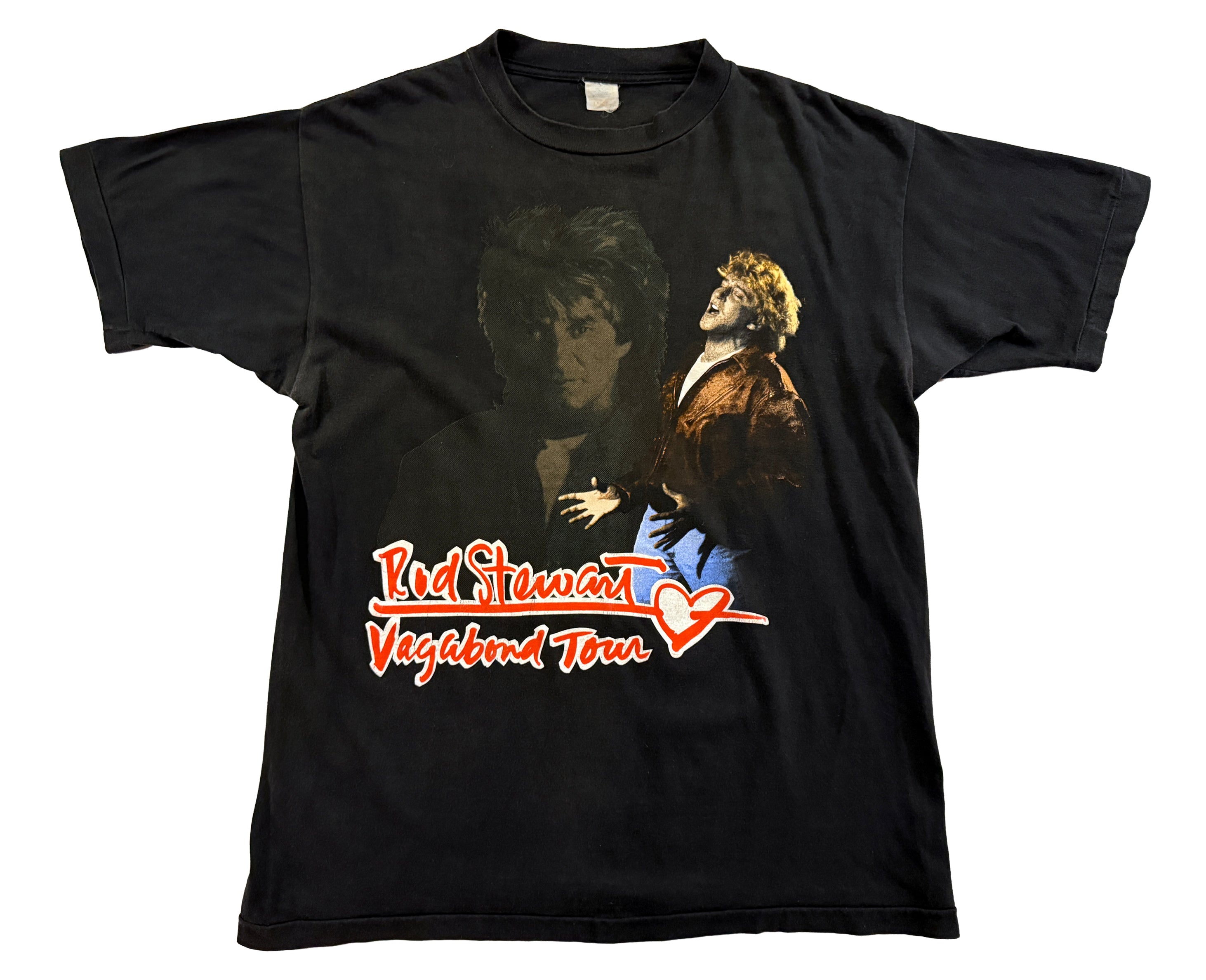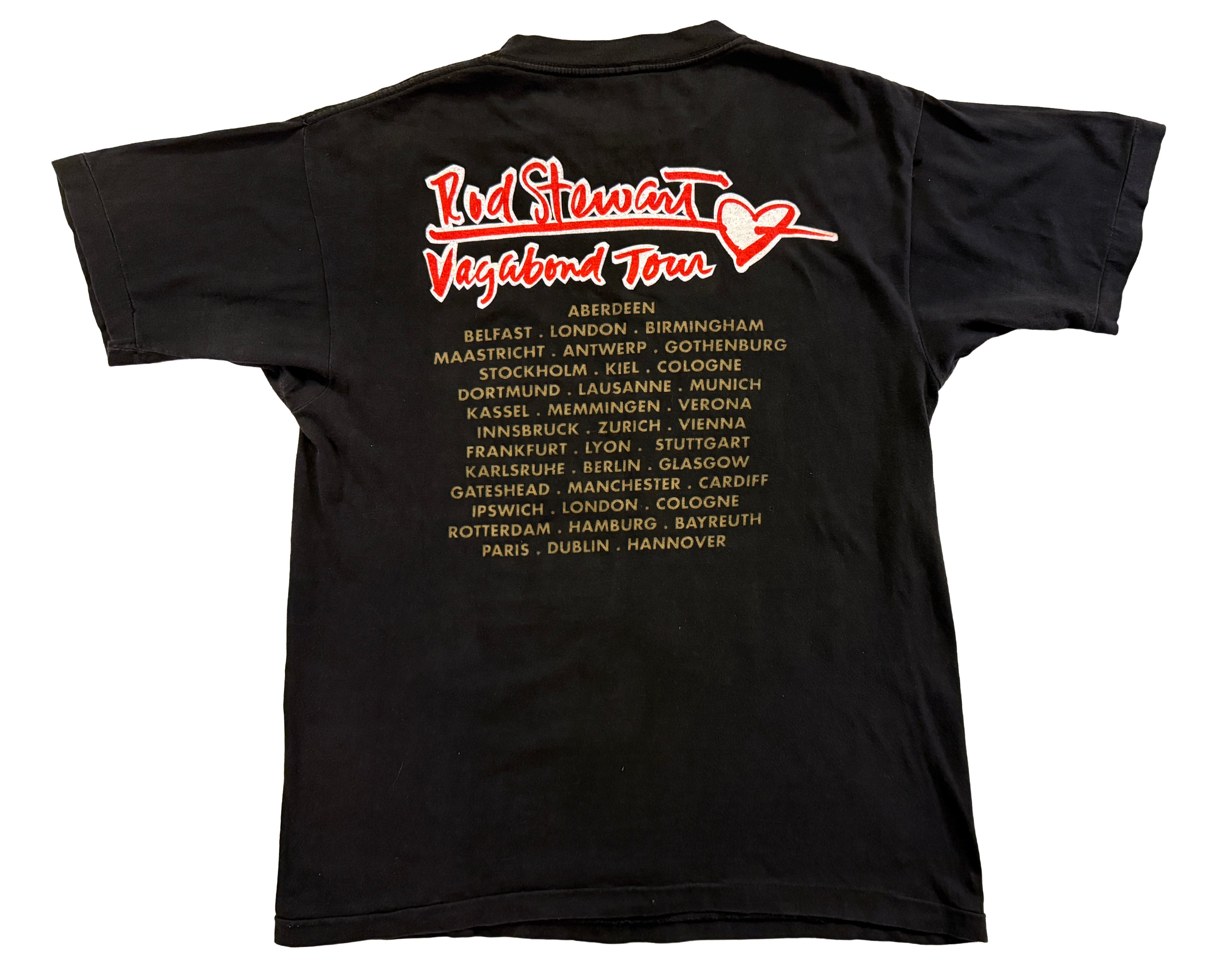 Vintage Rod Stewart 1991 Vagabond Heart Tour T-Shirt, released to accompany Rod Stewart’s Vagabond Heart tour, a major moment in his early-90s career following the success of the album of the same name. The front graphic features a classic photographic print of Stewart mid-performance, paired with the handwritten-style Vagabond Tour logo, while the back lists European tour dates including London, Manchester, Dublin, Paris, and Berlin. Printed on a black cotton tee with single-stitch construction, this piece has the soft handle and drape typical of early-90s tour merchandise. Condition is very good, with strong colour, clear print detail, and only light, age-appropriate wear consistent with its age. An easy, wearable piece of music history that works just as well styled casually as it does collected.