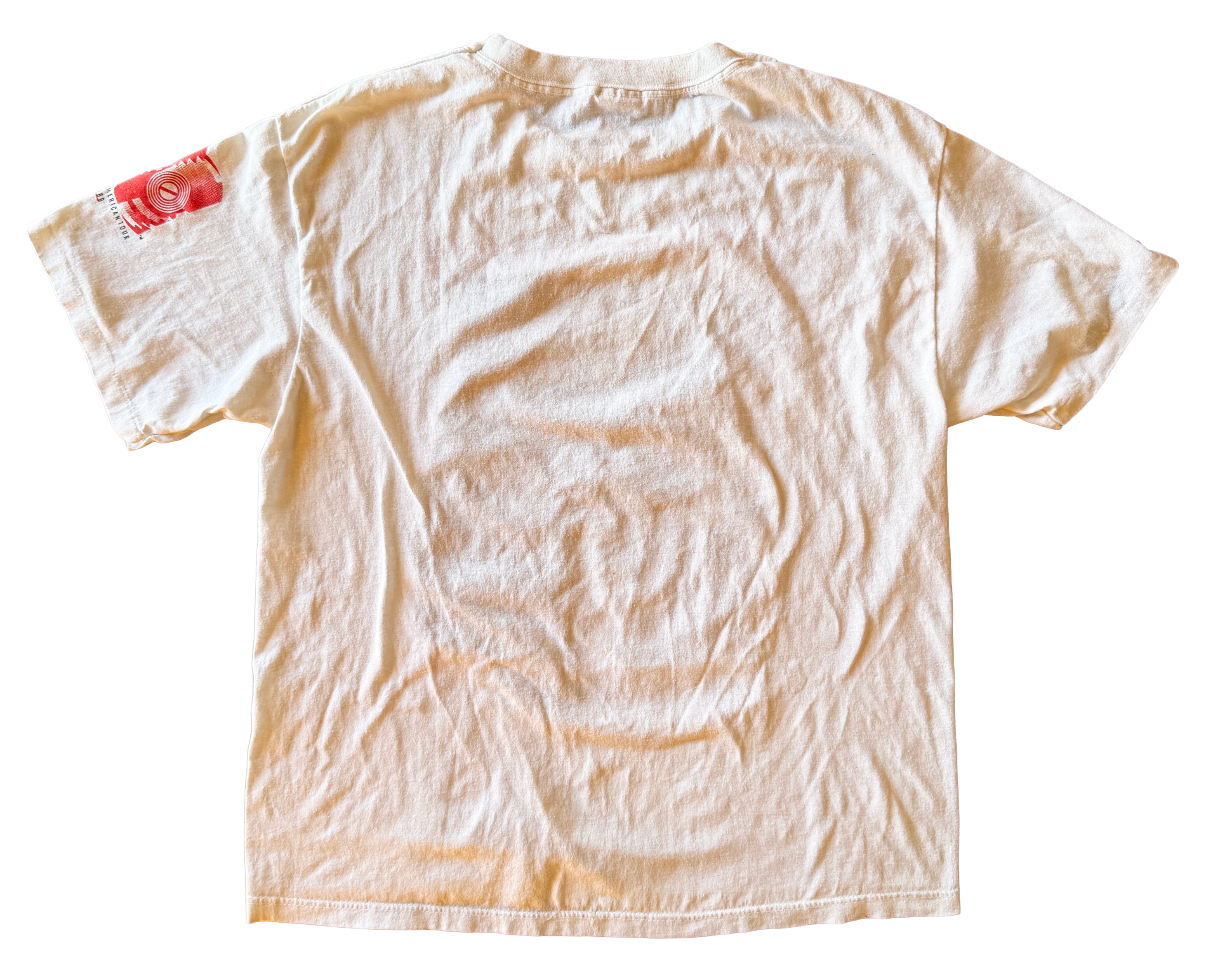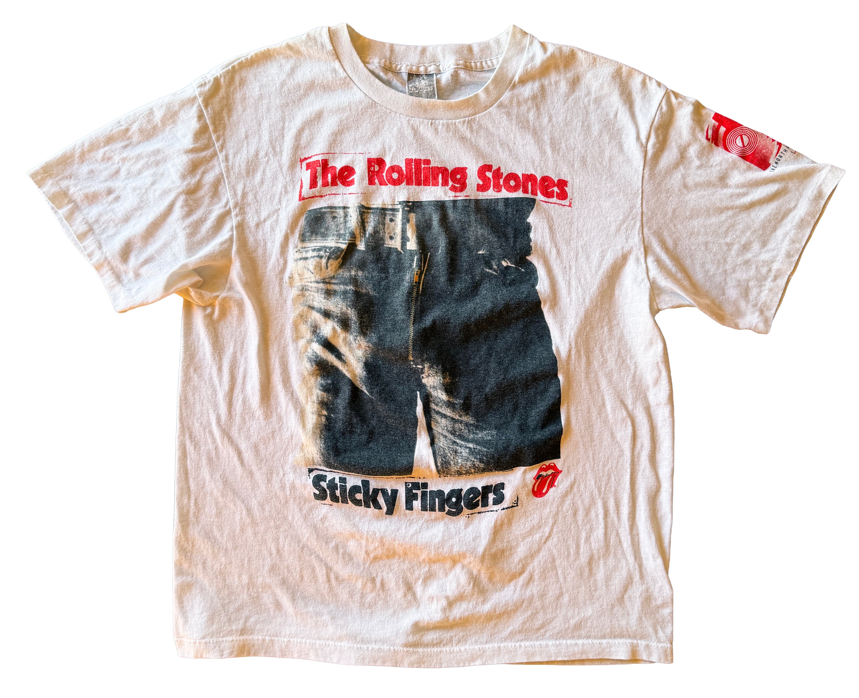 This original 1989 Rolling Stones Sticky Fingers tour tee brings one of the most iconic album visuals of all time to a soft, lived-in white cotton blank. The front features the legendary Andy Warhol–designed jeans artwork, paired with bold red Stones lettering and a small tongue logo — a design so distinctive that it’s become a cornerstone of classic rock imagery.