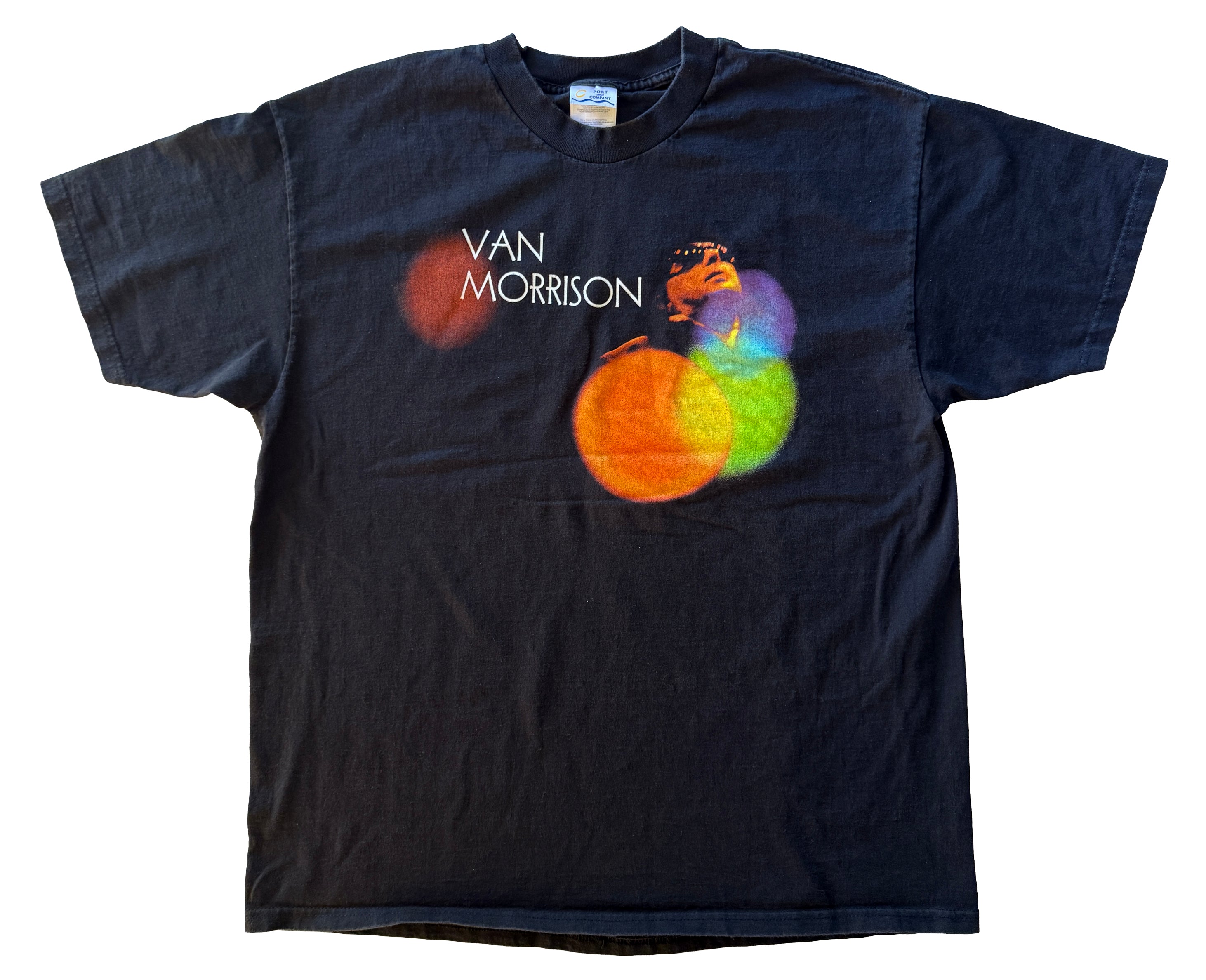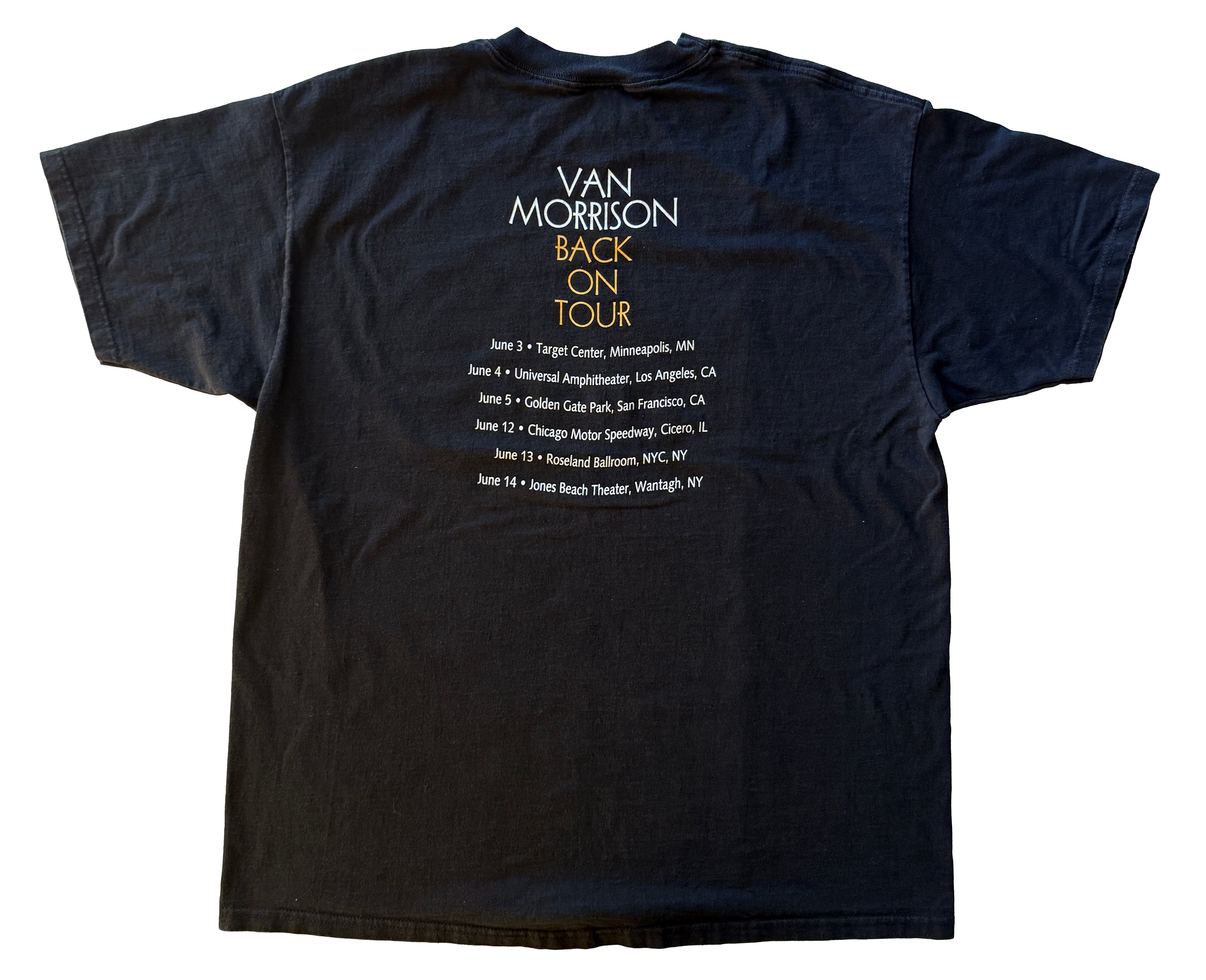 This original 1999 Van Morrison – Back On Tour tee carries the warm, atmospheric style that defined his late-90s live era. The front features a soft-focus photograph of Van performing, surrounded by glowing multicoloured lights that give the graphic a dreamy, almost jazz-club feel. It’s understated but striking — exactly the kind of design you’d expect from an artist whose concerts leaned into soul, blues, and quiet mastery rather than flash.